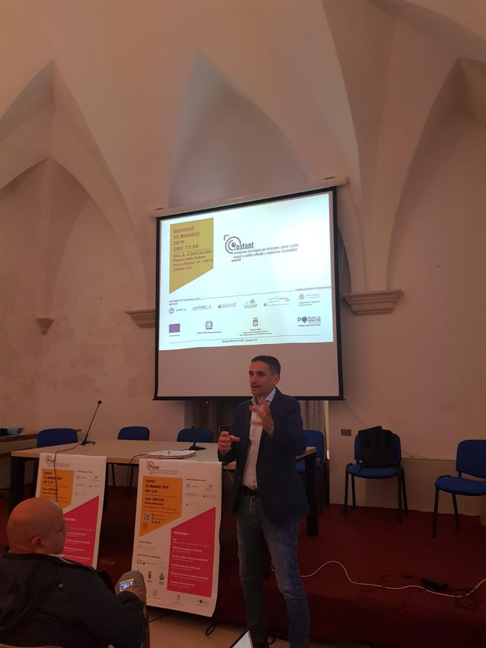 Valorizzare il patrimonio culturale per visitatori e turisti, rendendo il patrimonio artistico della città più attraente e accessibile attraverso l’uso di tecnologie. È questo l’obiettivo finale del progetto INSTANT – “Innovazione tecnologica per valorizzare i servizi turistici erogati in ambito culturale e migliorarne l’accessibilità” (www.instantinnovation.it), presentato nei giorni scorsi nella sala "Contaldo" del Palazzo della Cultura a Galatina, al cui interno insiste il Museo P. Cavoti che sarà, tra gli altri, oggetto di sperimentazione del progetto. L’appuntamento si è aperto con i saluti del Dott. Nicola Mauro, Assessore al Turismo e Marketing territoriale Comune di Galatina, e ha visto la partecipazione, in qualità di relatori, di partner e collaboratori del progetto: il Dott. Sabino Martiradonna (ARNIA), che ha illustrato il ruolo dei progetti regionali INNOLABS; il Prof. Luigi Patrono dell’Università del Salento, che ha relazionato in merito all’innovazione scientifica e tecnologica del progetto INSTANT; l’Ing. Pierluigi Carcagnì (CNR-ISASI Lecce), che ha illustrato il ruolo della Computer Vision in ambito museale; il Dott. Alessandro Capodieci e Ing. Antonio Perrone del GAL Valle della Cupa, uno dei partner associati, insieme a Comune di Cavallino, Galatina e Carovigno, nonché Li Calizzi Agriturismo, per la sperimentazione di INSTANT; e il Dott. Sergio De Giuseppe (CO.M.MEDIA), che ha illustrato la strategia comunicazione e di Focus Group di progetto. A latere della presentazione, infatti, è stato organizzato il primo dei “Focus Group” previsti, all’interno del quale i partecipanti, supportati dagli esperti del Dipartimento di Ingegneria dell’Innovazione dell’Università del Salento, sono stati invitati ad esprimersi al fine di condividere e co-progettare, in ottica partecipativa, i servizi previsti da INSTANT. Il progetto INSTANT, così come emerso nel corso della serata, prevede la realizzazione di un sistema, sia hardware che software, che, attraverso l’uso di tecnologie emergenti ed innovative (quali dispositivi mobili, app, Bluetooth Low Energy, dispositivi indossabili, etc), offrirà al visitatore la possibilità di vivere delle esperienze personalizzate. Molto interessante, tra l’altro, la sperimentazione di un sistema innovativo in grado di rendere le strutture turistiche più adatte alle persone con disabilità visiva (ipovedenti). Il progetto, poi, prevede la pianificazione di living lab, che consentiranno ai partecipanti di co-realizzare e testare le funzionalità del sistema, restituendo i propri feedback. Seguirà una fase di disseminazione dei risultati ottenuti attraverso la realizzazione di workshop tematici, la partecipazione a conference nazionali ed internazionali, la sottomissione di paper a journal su temi inerenti al progetto e comunicazione sul web. Il progetto, finanziato nell’ambito del bando Innolabs – POR PUGLIA FESR FSE 2014-2020 Fondo Europeo Sviluppo Regionale – Sub Azione 1.4.B, è gestito da ARNIA Società Cooperativa, capofila di progetto, con la partnership di Co.m.media srl, Arancia ICT srl, L.E.SVI.L. (Laboratorio di Economia dello Sviluppo Locale) e CNR Science APP, e realizzato con la collaborazione dell’Università del Salento Dipartimento di Ingegneria dell'Innovazione.