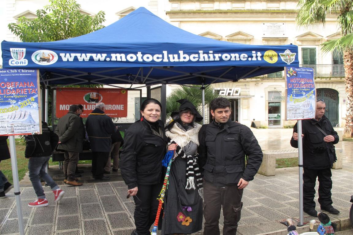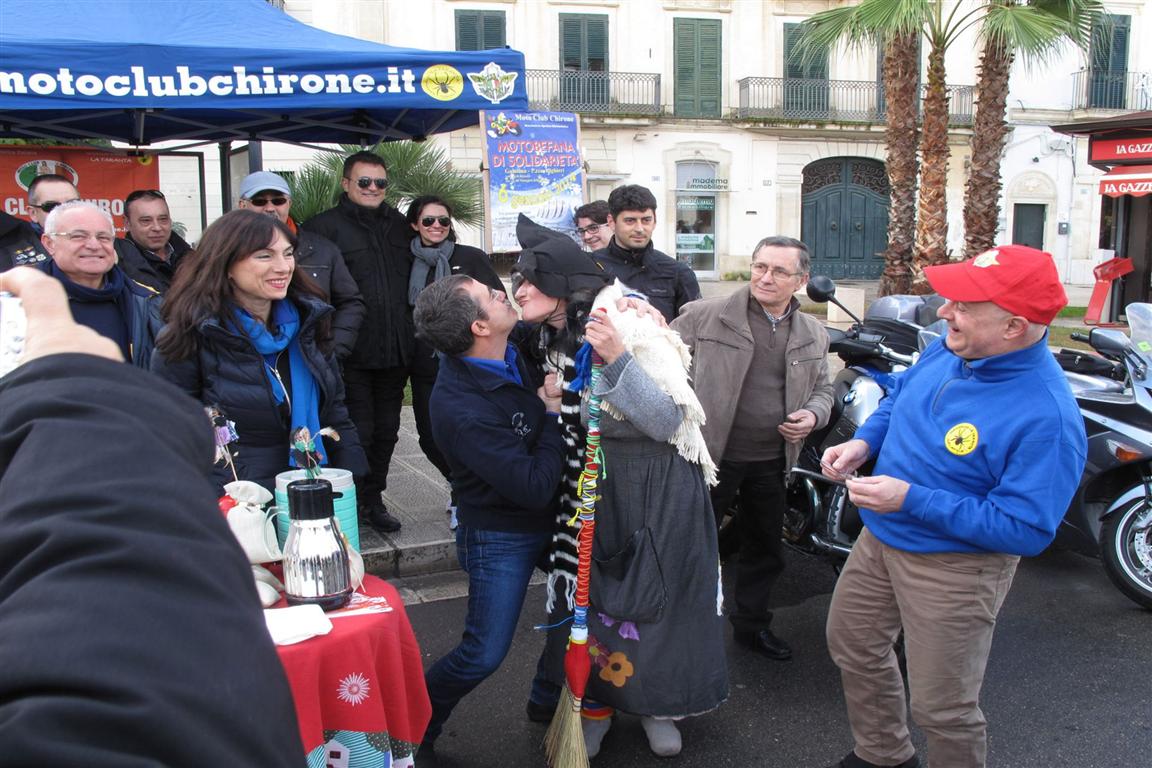 Anche quest'anno i soci del Motoclub Chirone di Galatina, guidati dal presidente Gino Codazzo, hanno voluto dare vita alla 'Motobefana di solidarietà'. Hanno raccolto fondi e doni in natura e li hanno consegnati alla Caritas della Parrocchia San Sebastiano. Una simpatica Befana, con il classico abito della dispensatrice di doni, inforcata la tradizionale scopa, ha fatto un giro in moto intorno a Piazza Alighieri. Alle ore 12 in punto don Dario De Pascalis, parroco di San Sebastiano, ha raggiunto i centauri schierati di fronte alla 'Lampada senza luce' e, dopo averli ringraziati, li ha benedetti ed esortati a continuare tutti i giorni nelle opere di carità e di vicinanza a chi ha bisogno. Dopo gli immancabili auguri, la Befana ha abbandonato la scopa e, indossato il casco, è partita con tutta la carovana alla volta di Porto Badisco.