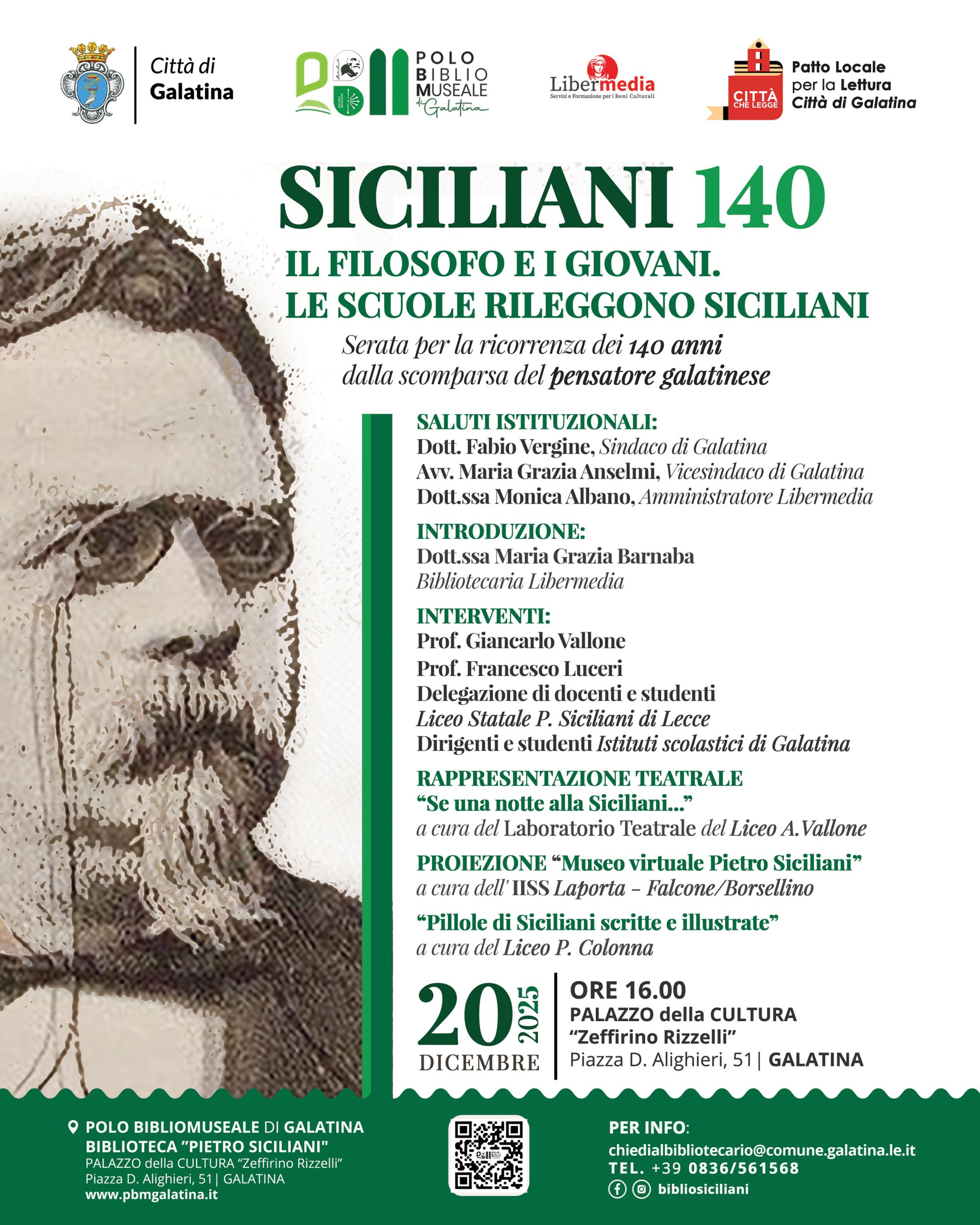 Chiuderanno l’iniziativa le studentesse e gli studenti dei vari Istituti superiori della città, che illustreranno il risultato finale del lavoro di rilettura dell’opera di Pietro Siciliani, svolto nelle proprie classi, guidati dai rispettivi docenti. Un lavoro che ha permesso di conoscere ed approfondire la figura del filosofo galatinese, interpretandolo con gli occhi e la mente della loro generazione.