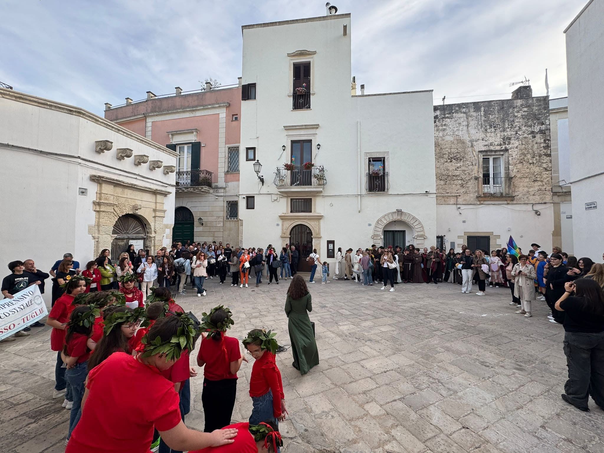 Protagoniste indiscusse cinque scuole del territorio: Polo 1 Galatina-Collemeto, Polo 3 Galatina-Noha, Liceo “Vallone”, I.C. Collepasso-Tuglie e I.C. Polo 1 Nardò. Cinque istituti, un solo cuore. Dirigenti, docenti, studenti e famiglie hanno costruito una rete autentica, animati da entusiasmo, visione condivisa e orgoglio. Gli studenti sono stati il centro della giornata. Le loro voci, strumenti, danze e parole hanno trasformato Galatina in un percorso emozionale a cielo aperto. Cori, orchestre, teatro, coreografie si sono alternate in un flusso continuo, capace di unire generazioni e linguaggi. Toccante il musical “Forza venite gente”, con costumi storici e recitazione intensa, ponte tra memoria e presente. Le letture poetiche e i brani, dalla tradizione locale fino alla potente “We Are the World”, hanno lanciato un messaggio corale: vogliamo la pace, crediamo nel futuro.