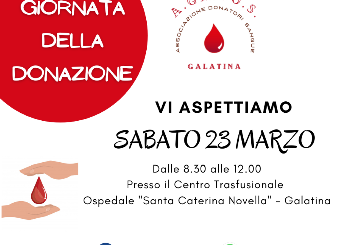 A.GA.DO.S., Associazione Galatinese Donatori Sangue, comunica che la prossima Giornata della donazione si terrà Sabato 23 Marzo 2024 presso il Centro trasfusionale dell'ospedale “Santa Caterina Novella”