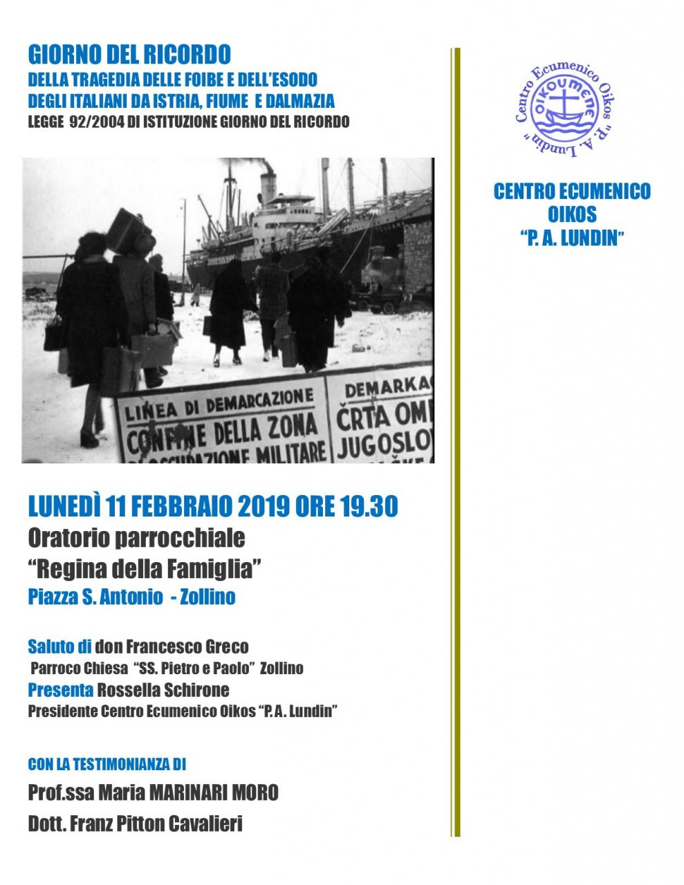Come come ogni anno anche il Centro Ecumenico Oikos ha organizzato un incontro per ricordare e rinnovare la memoria della tragedia degli italiani, di tutte le vittime delle foibe, dell'esodo dalle loro terre degli istriani, fiumani e dalmati nel secondo dopoguerra e della più complessa vicenda del confine orientale.