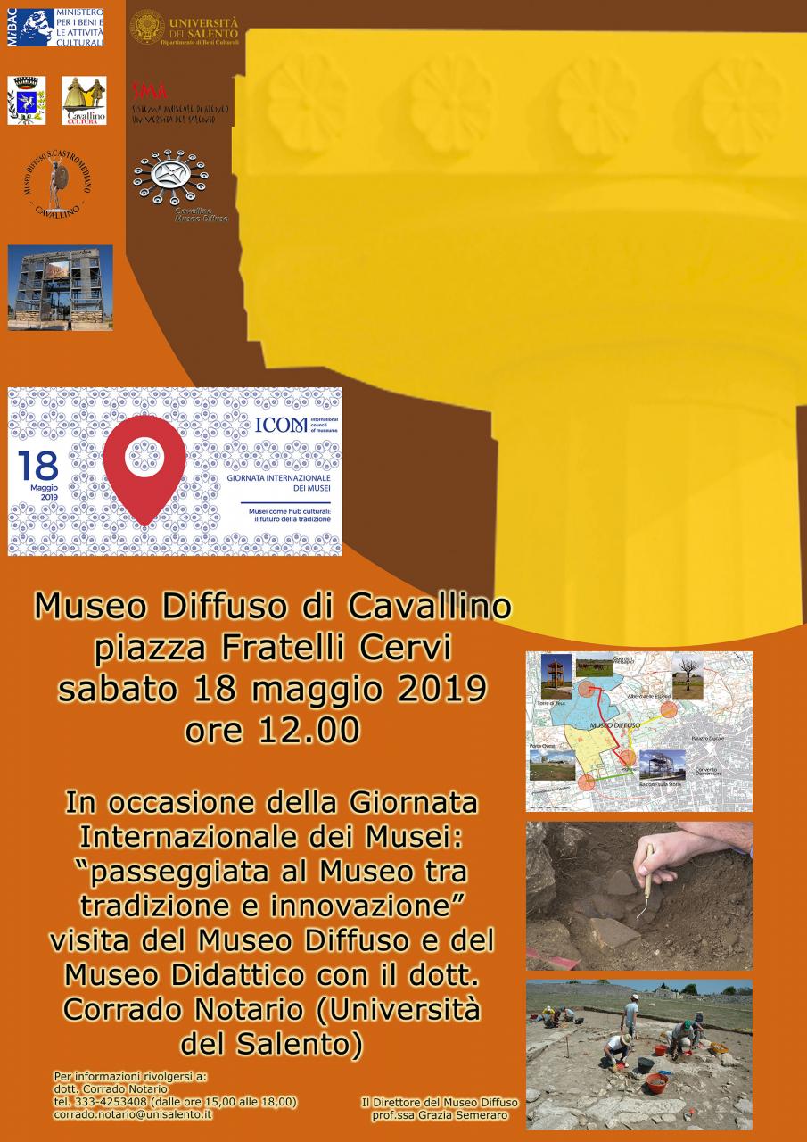 In occasione della Giornata Internazionale dei Musei organizzata dall’ICOM - International Council of Museums, una “passeggiata al Museo tra tradizione e innovazione” è in programma sabato 18 maggio 2019, alle ore 12, al Museo Diffuso di Cavallino (piazza Fratelli Cervi, Cavallino, provincia di Lecce), uno dei sette Musei del Sistema Museale d’Ateneo dell’Università del Salento. A guidare la “passeggiata” il dottor Corrado Notario, responsabile tecnico-scientifico del Museo.