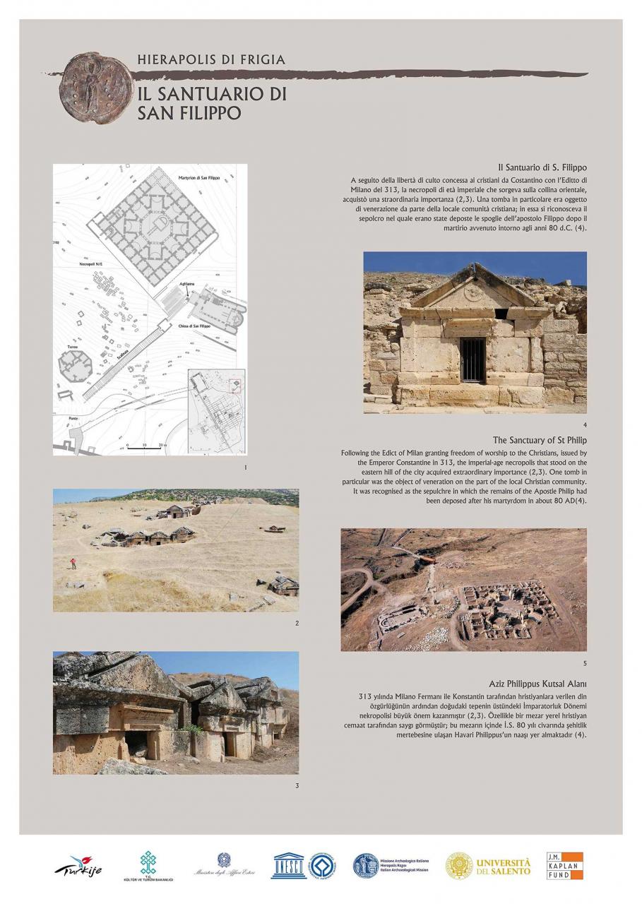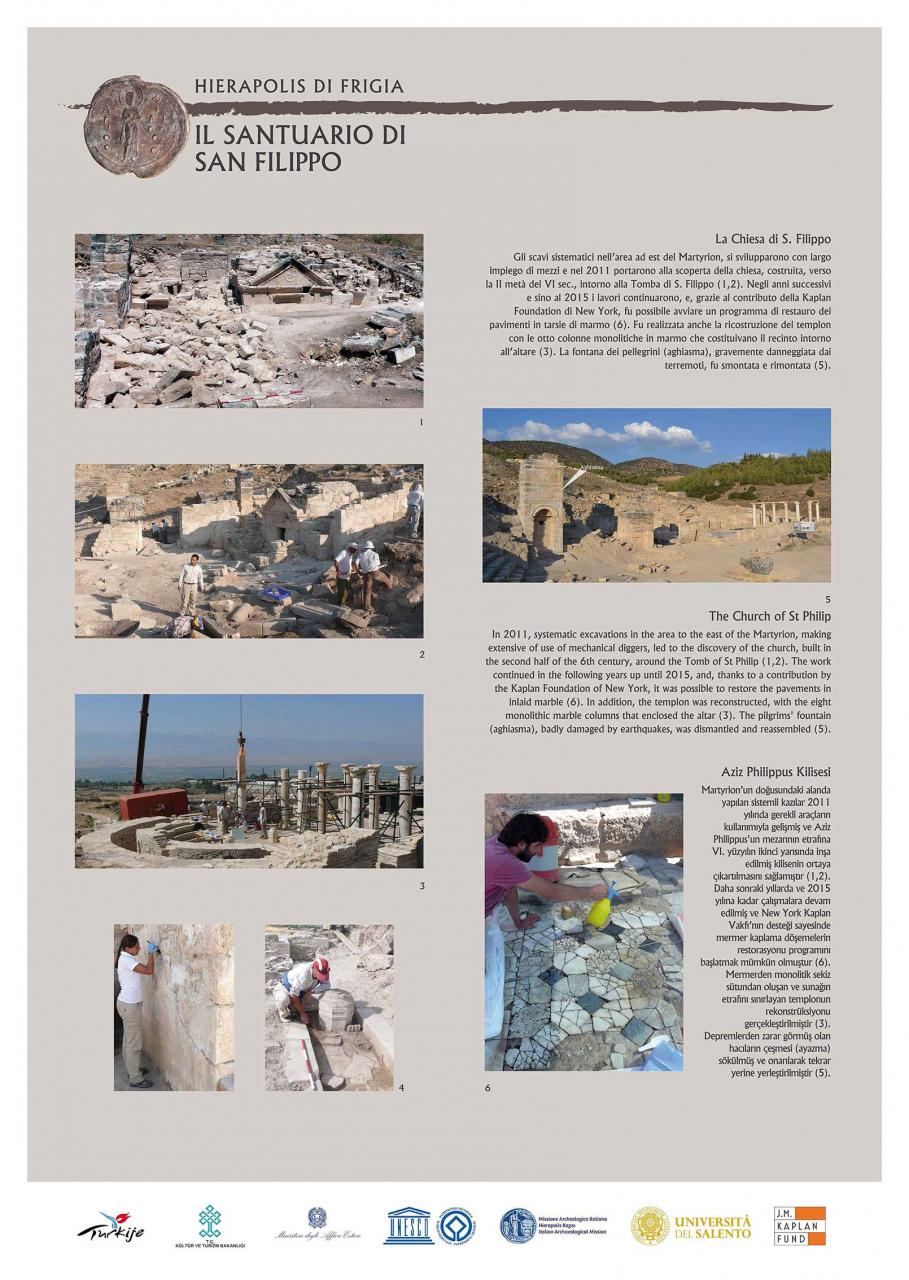 L’esposizione, realizzata in occasione dei sessant’anni di attività della Missione Archeologica Italiana di Hierapolis di Frigia (MAIER), illustra con pannelli fotografici l’importante scoperta del Santuario dedicato all’Apostolo Filippo appunto a Hierapolis, nella Frigia meridionale (Turchia). La Missione, attualmente diretta dalla professoressa Grazia Semeraro dell’Università del Salento, ha restituito importanti monumenti dell’antica città: il Teatro (recentemente restaurato), la Necropoli, il Santuario di Plutone e la Porta degli Inferi.