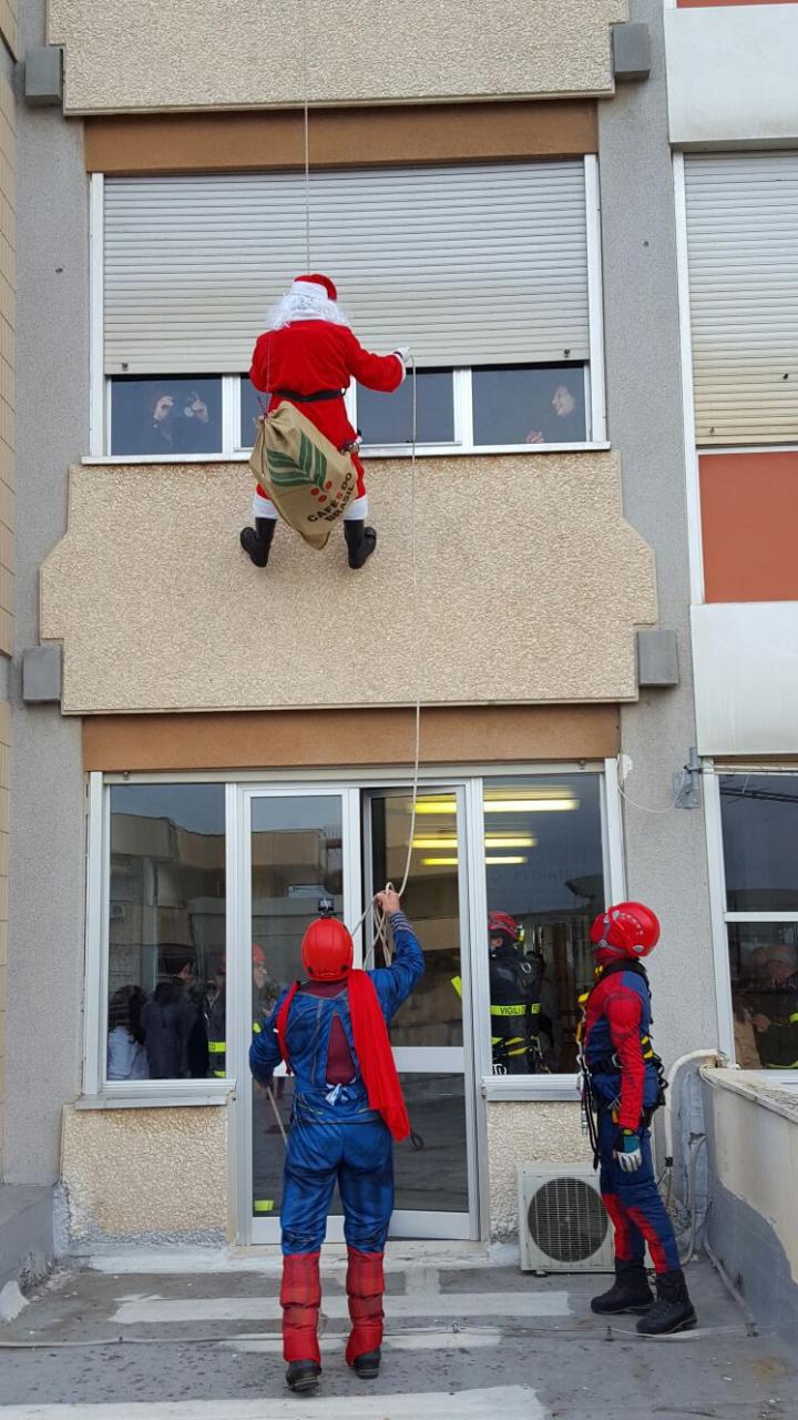 C’erano l’uomo ragno, superman, l’elfo e, naturalmente, Babbo Natale. I Vigili del Fuoco del Comando Provinciale di Lecce, vestiti con “divise” decisamente fuori ordinanza, stamattina hanno portato i doni ai bambini ricoverati nella Pediatria del “Vito Fazzi”. Una sorpresa fatta a modo loro, da consumati acrobati travestiti da super eroi e personaggi dei fumetti e, soprattutto, calandosi dal quarto piano per raggiungere i piccoli pazienti e materializzare i loro sogni più belli, fatti di giocattoli e sorrisi.