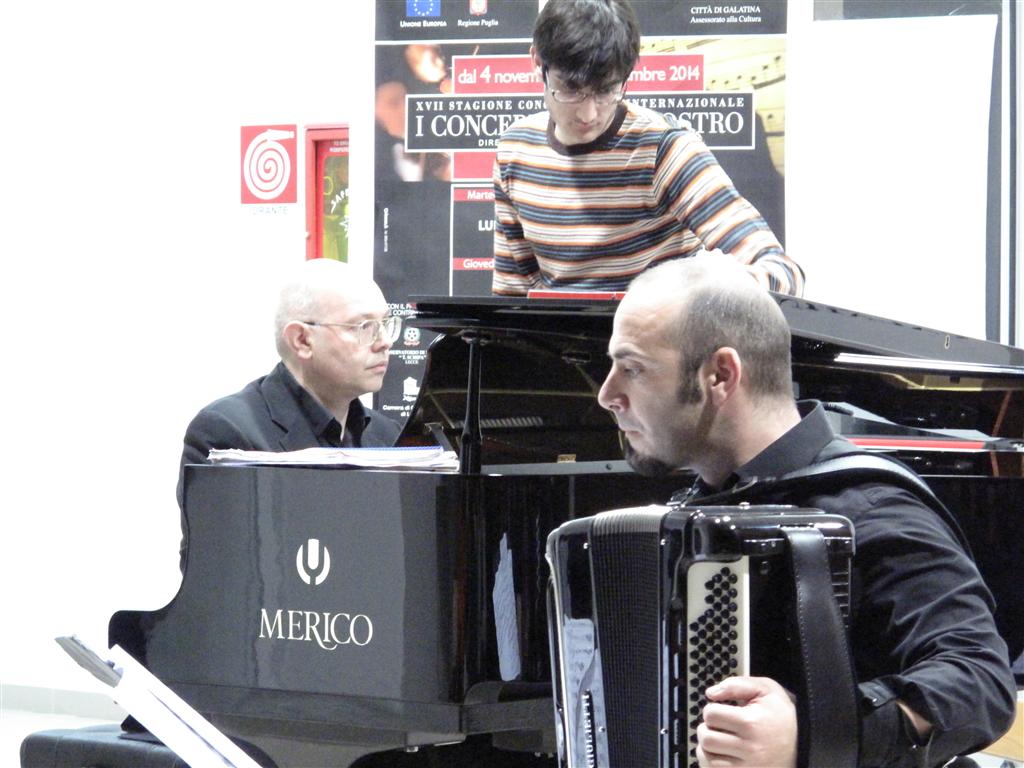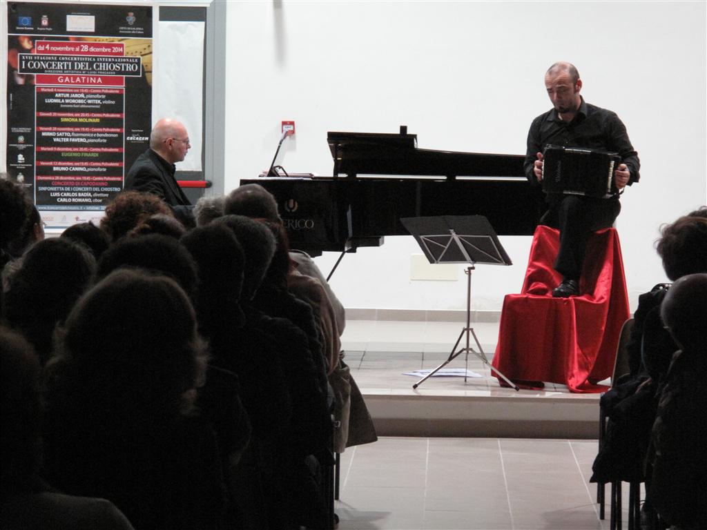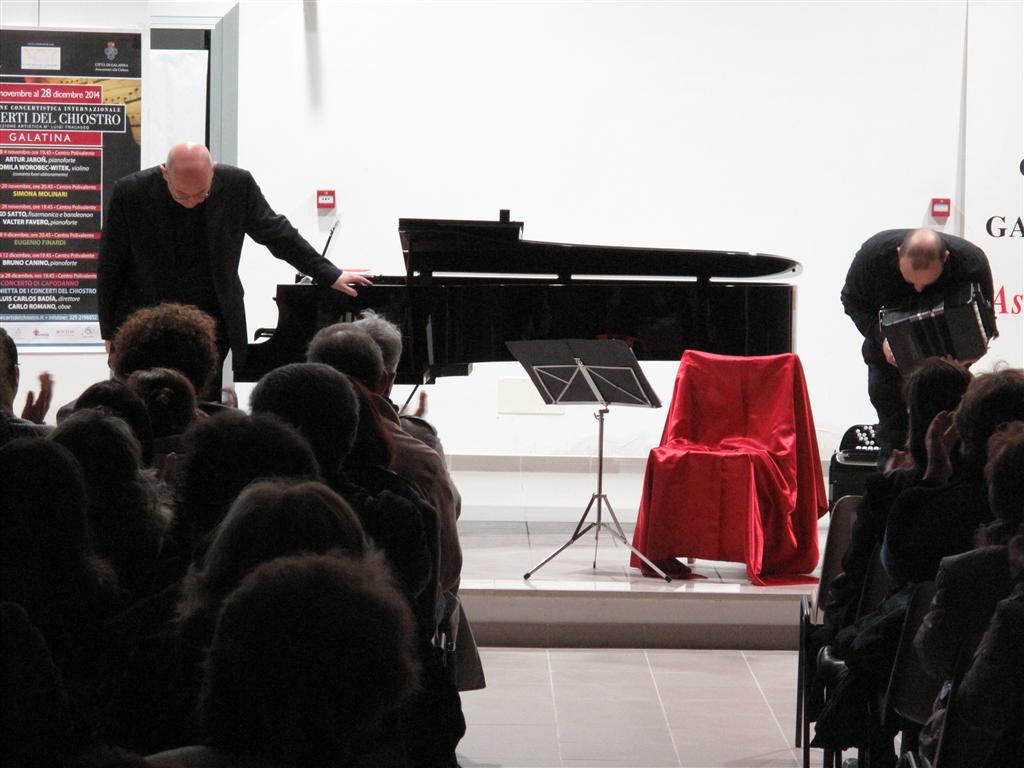 “Ho conosciuto questo musicista a Melbourne. Ora è chiaro a tutti perché gli ho detto che avrebbe dovuto venire a suonare a Galatina, per “I Concerti del Chiostro”. Luigi Fracasso sorride alla fine dell’intrigante concerto di Mirko Satto (fisarmonica e bandeonon) e Valter Favero (pianoforte). Il suo riferimento, con abbraccio, è a Satto mentre il suo sguardo va anche verso Favero.