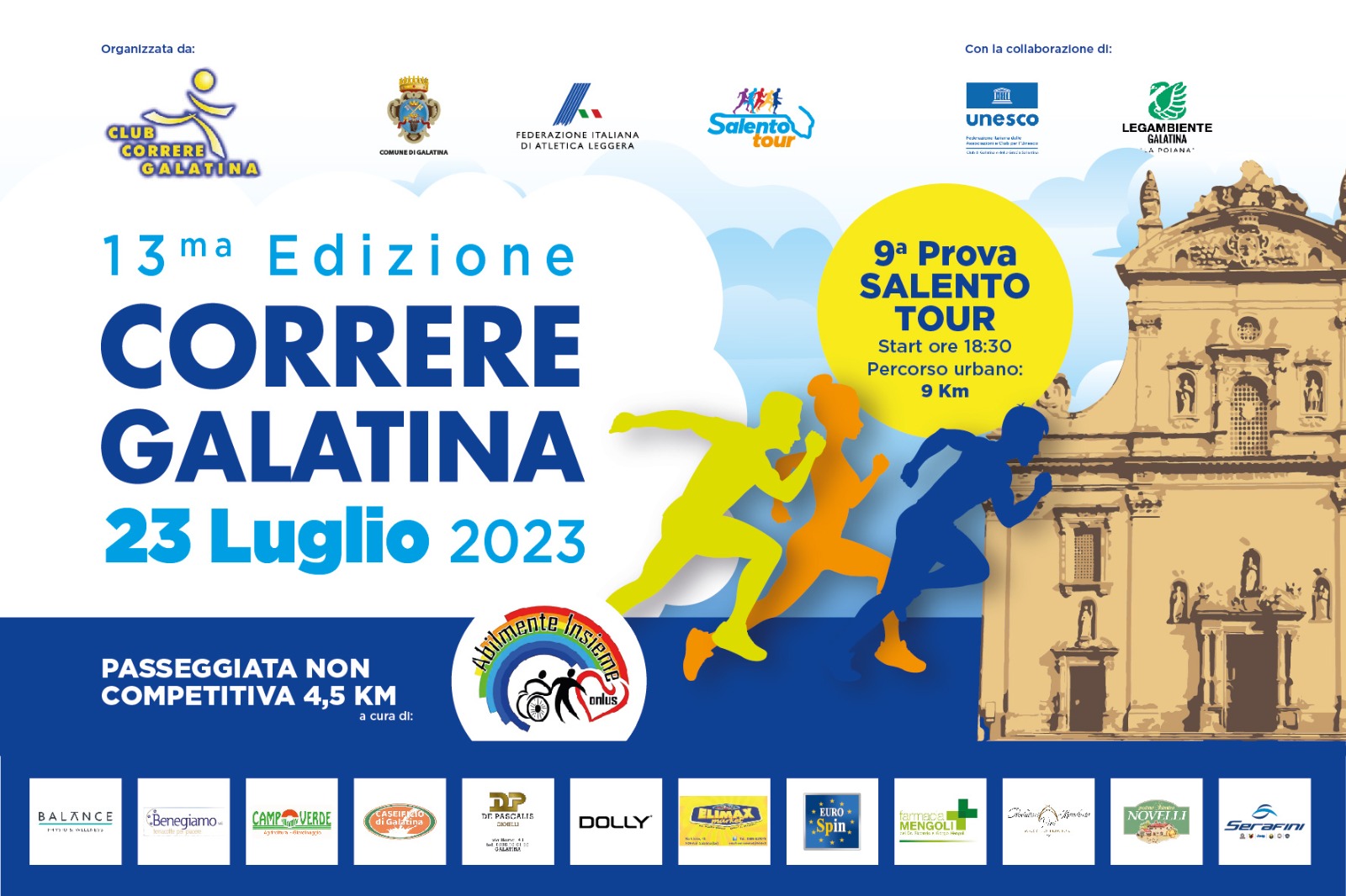 La nona prova "Salento tour" di corsa su strada si terrà domenica 23 luglio 2023 a Galatina. Alla XIII edizione di 'Correre Galatina' sono attesi almeno mille partecipanti (600 iscritti alla gara ufficiale).