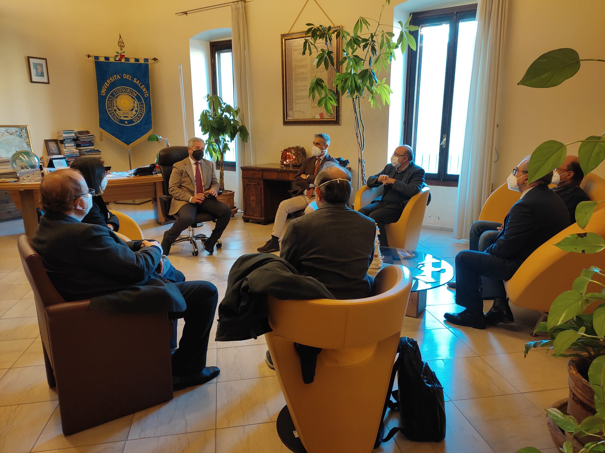 Nelle immagini: • l’incontro in Rettorato – foto di gruppo; da sinistra: Giuseppe Nicolardi, docente di Anatomia Umana – UniSalento; Luisa Siculella, Presidente corso di laurea in Medicina e chirurgia – UniSalento; Donato De Giorgi, Presidente Ordine dei Medici di Lecce; Fabio Pollice, Rettore UniSalento; Michele Accogli, responsabile della formazione per l’Ordine dei Medici di Lecce; Domenico Rocco, responsabile per la comunicazione dell’Ordine dei Medici di Lecce; Pietro Alifano, docente di Microbiologia e coordinatore del gruppo di lavoro per il progetto MedTec; Luigi Peccarisi, vice Presidente Ordine dei Medici di Lecce;