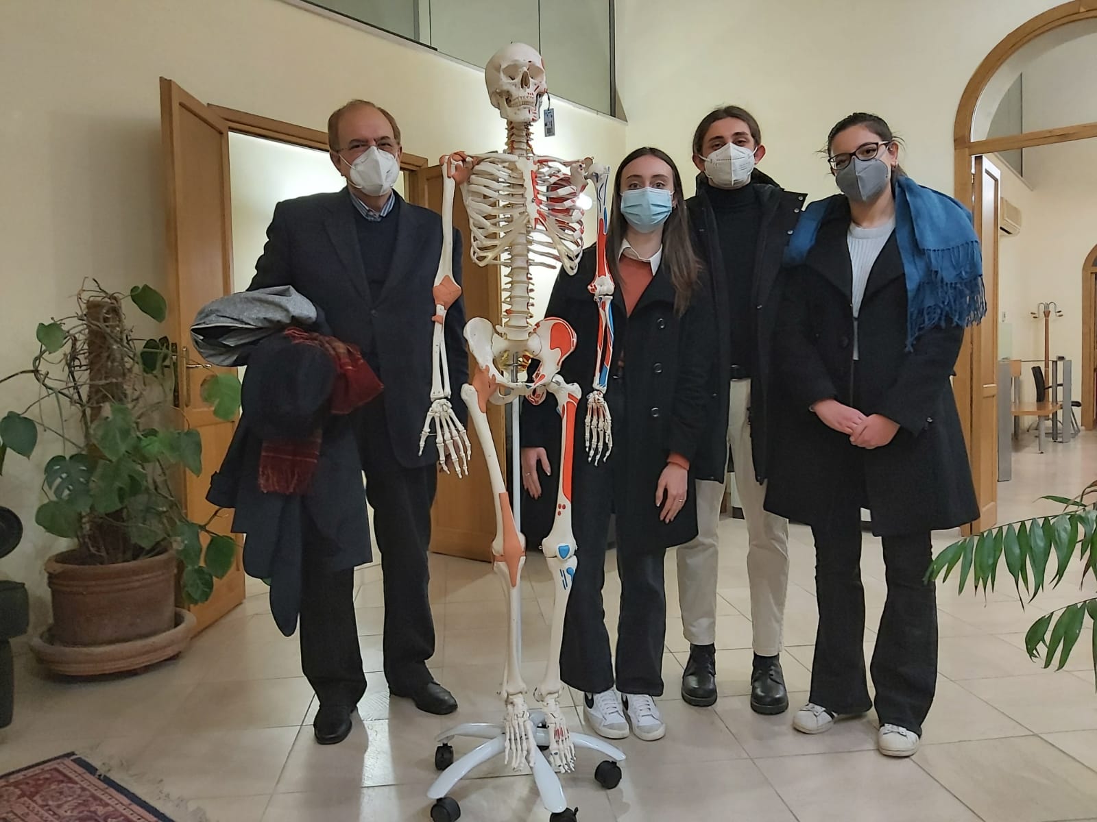 L’Ordine dei Medici chirurghi e degli odontoiatri della provincia di Lecce ha donato all’Università del Salento un modello di scheletro umano, destinato a supportare l’attività didattica degli studenti del corso di laurea in Medicina e chirurgia. Avviato quest’anno a UniSalento e a orientamento “MedTec”, il corso è frequentato da circa sessanta studenti, alcuni dei quali hanno montato lo scheletro sotto la guida dei docenti. La donazione rappresenta simbolicamente l’avvio di una nuova fase di collaborazione tra l’Ateneo e l’Ordine. «Vogliamo intraprendere con l’Ordine dei Medici - la cui vicinanza è stata fondamentale per l’avvio del corso di laurea in Medicina - un percorso di collaborazione, più incisivo e strutturato», sottolinea il Rettore Fabio Pollice, «Una collaborazione che possa fattivamente contribuire a fare del nostro corso di laurea un’eccellenza, a sviluppare un progetto didattico integrato in cui siano coniugate competenze tecnico-scientifico, sensibilità umana ed etica professionale. Uno dei primi passi è la creazione di un centro di simulazione medica all’avanguardia, imprescindibile per le esercitazioni degli studenti. Per la sua realizzazione sarà fondamentale la collaborazione con le imprese e con le istituzioni che operano sul territorio. È significativo che la prima donazione arrivi proprio dall’Ordine dei Medici. Ed è proprio dalla collaborazione con l’Ordine che è nata un’iniziativa molto importante: offrire agli studenti, parallelamente al percorso formativo, dei periodi di affiancamento ai medici di base. Un’iniziativa che contiamo di far partire dal prossimo semestre. È infatti cruciale anticipare già al primo anno di corso questo tipo di esperienze, così da consentire agli studenti di “vivere” la professione medica nella sua totalità, valorizzando in particolare il rapporto coi pazienti, consci che un buon medico è quello che sa costruire un rapporto di fiducia con il paziente e sa “prendersene cura”. Appena la situazione pandemica lo consentirà, inoltre, agli studenti verranno peraltro proposti anche periodi di volontariato in aree all’estero caratterizzate da difficoltà sanitarie. Il profilo in uscita dei medici formati a UniSalento sarà dunque doppiamente eccellente», conclude il Rettore, «per preparazione scientifica e per capacità pratiche e umane». «Questo scheletro didattico è un dono certamente simbolico, ma un simbolo altamente significativo: lo scheletro rappresenta la struttura dell’essere umano, la sua essenza», ha detto Donato De Giorgi, Presidente dell’Ordine di Medici di Lecce, nel corso dell’incontro avvenuto in Rettorato per la consegna formale del modello, «ciò che lo sostiene e ciò che rimane nei secoli, ben oltre la morte fisica, come dimostrano le ricerche archeologiche. L’Ordine ribadisce così la sua vicinanza all’Ateneo salentino, e sposa pienamente la linea tracciata dal Rettore, il cui entusiasmo e la cui progettualità sono fondamentali per il futuro del corso di laurea in Medicina. L’Ordine è al fianco di UniSalento per raggiungere l’obiettivo della formazione di eccellenza dei nostri futuri colleghi medici».