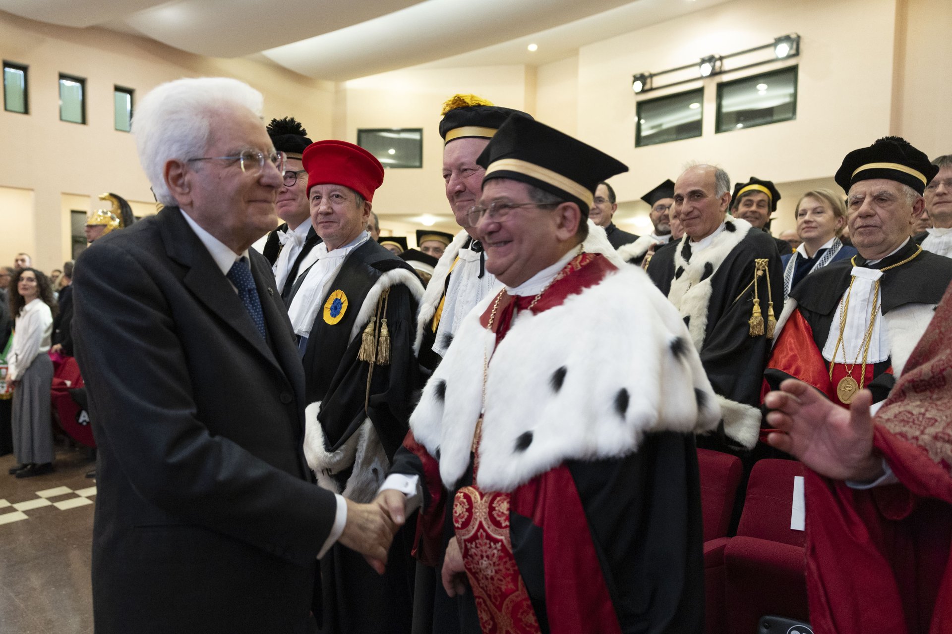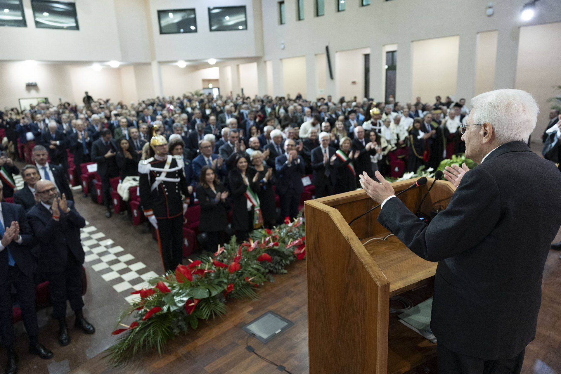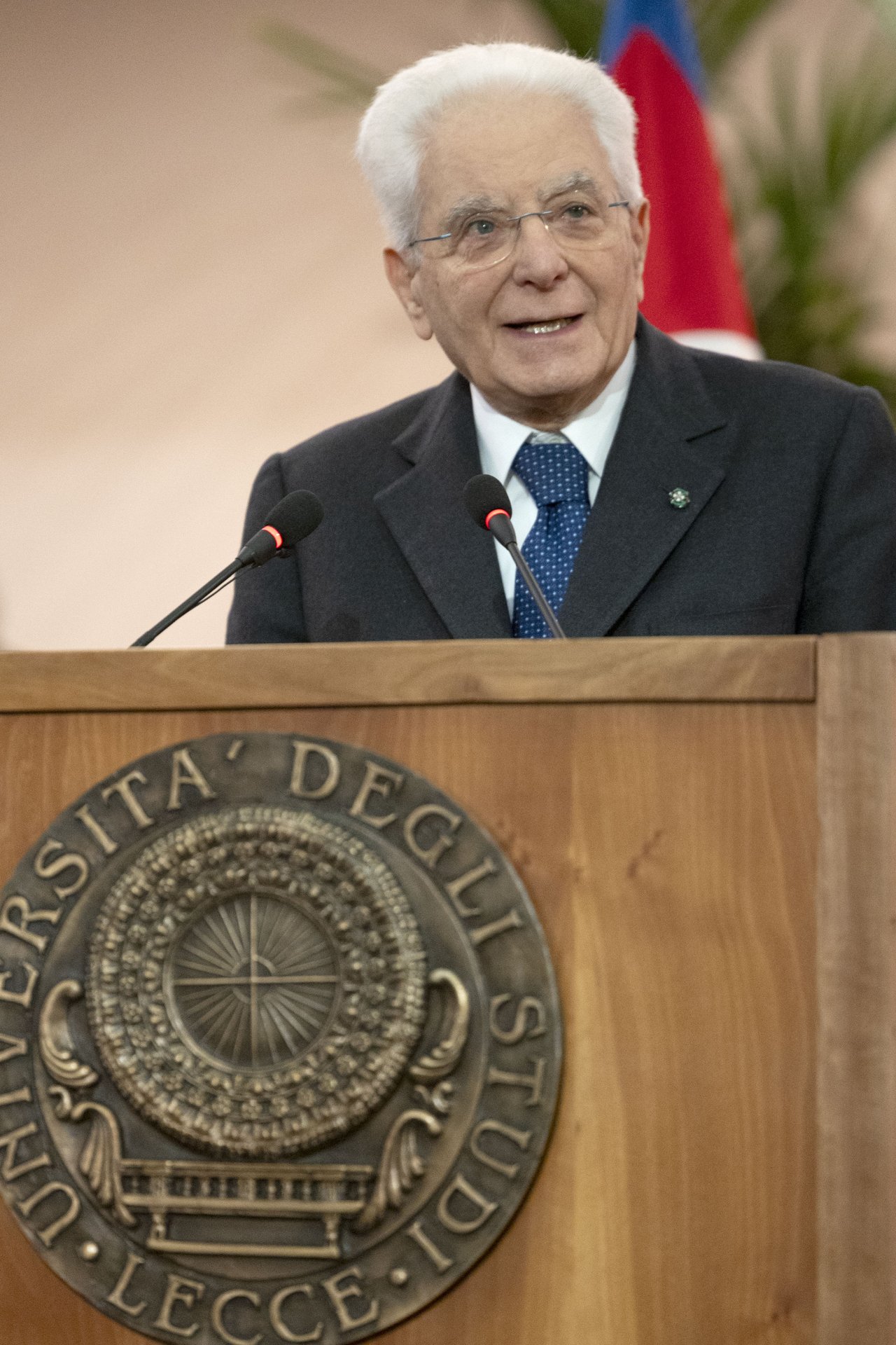 Collegare il momento di nascita dell’Ateneo con quello di oggi, a settant’anni. Quel momento, nei primi anni ‘50, con l’Italia ancora dentro le difficoltà della devastazione della guerra, con i territori in difficoltà. Va ricordata l’intuizione e il grande merito lungimirante - come è stato sottolineato poc’anzi - dei cittadini, di persone, di coloro che hanno immaginato, proposto, assecondato, condiviso, appoggiato, così diffusamente, nel popolo del Salento, la decisione di investire sulla cultura, non soltanto come decisivo elemento di crescita sociale, di piena cittadinanza di ciascuno, ma anche come motore di sviluppo del territorio. È stato quello un momento di meridionalismo adulto, protagonista. Quel momento va collegato a quello di oggi, mi sembra, da quanto abbiamo ascoltato. Non soltanto perché l’Ateneo, che ha contribuito allo sviluppo del territorio, continua a promuovere, accompagnare questo sviluppo, ma anche perché l’Ateneo offre, così come le altre Università del nostro Paese, in questo momento storico, l’opportunità di dare una risposta alla ricerca di nuovi assetti nelle condizioni che mutano. Quanto avviene, mutamenti così profondi, veloci, radicali, dalla Intelligenza Artificiale, alla grande intensità di strumenti di comunicazione e di connessione, mutano le condizioni della vita del mondo e vi è l’esigenza di individuare nuovi equilibri, e questi vanno trovati attraverso la cultura. È questo il compito che gli Atenei svolgono e che, in questo territorio, svolge questo Ateneo. Si tratta - come è stato detto poc’anzi- di stimolare la ricerca, la trasmissione del sapere, nel collegamento tra le varie discipline di studio e di scienza, senza loro separazione, ma con loro convergenza, interagendo fra di esse, per porre sempre al centro di queste trasformazioni la persona umana.