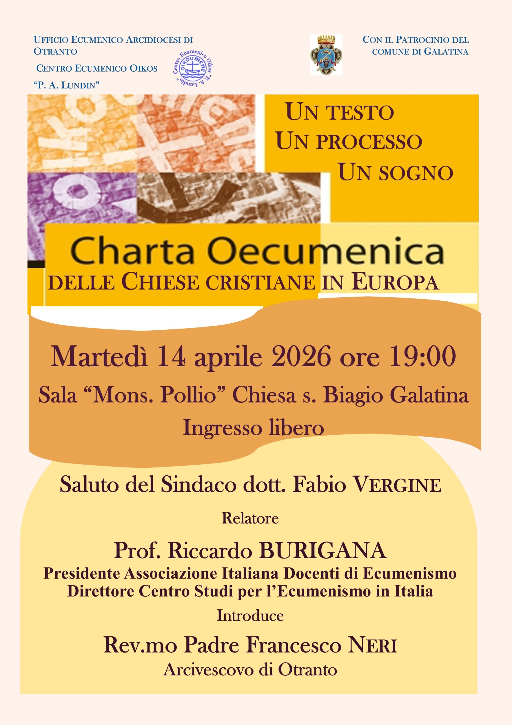 L’Incontro è promosso dall’Ufficio per l’ecumenismo e il dialogo dell’Arcidiocesi di Otranto e dal Centro Ecumenico Oikos “P. A. Lundin” di Galatina