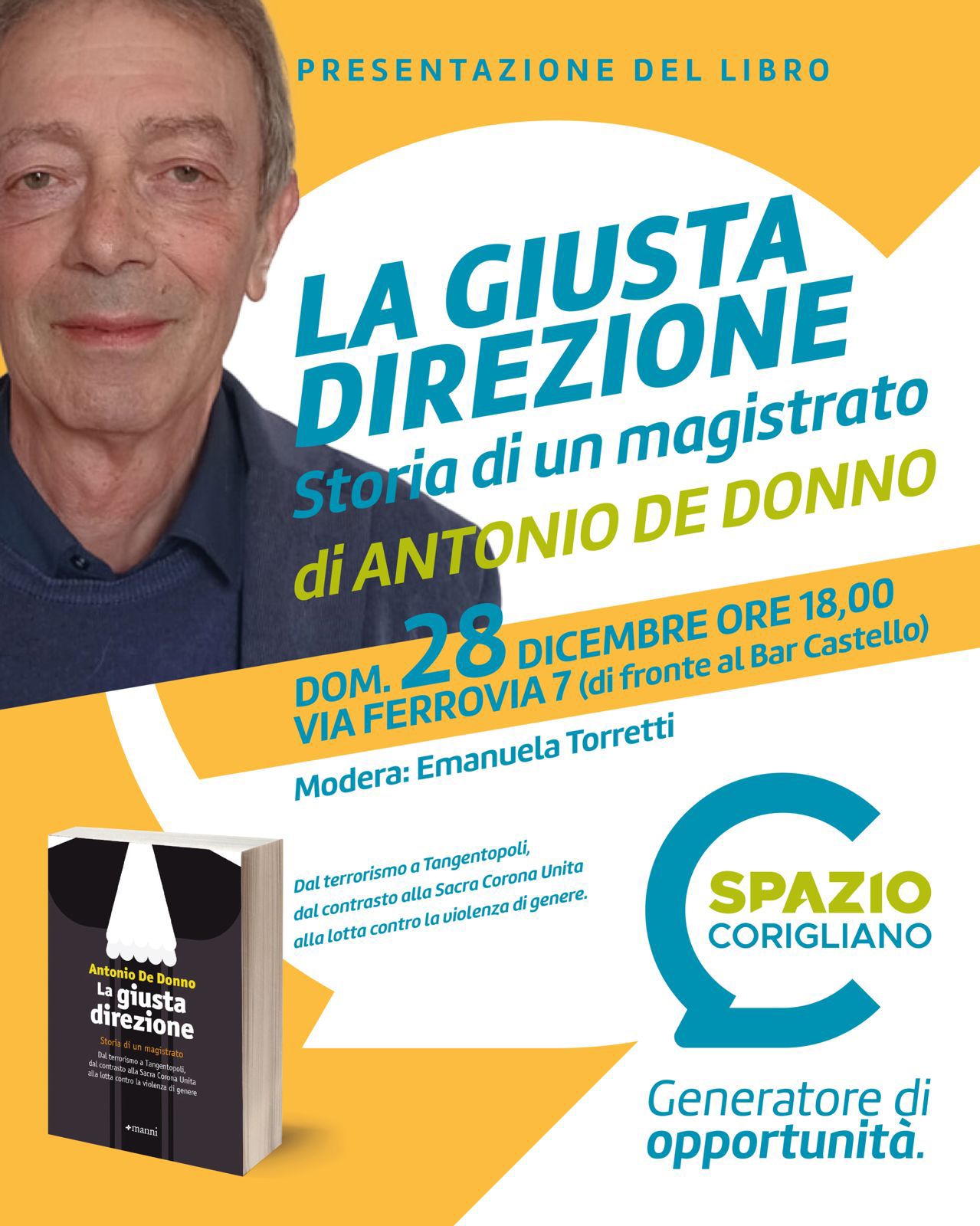 Un appuntamento di alto profilo civile e culturale quello previsto per domenica 28 dicembre 2025, alle ore 18:00, presso "Spazio Corigliano". Il contenitore politico-culturale di via Ferrovia n. 7 (di fronte al Bar Castello) ospiterà il dottor Antonio De Donno, già magistrato in prima linea nel contrasto alla criminalità organizzata, per la presentazione del suo ultimo libro dal titolo "La giusta direzione. Storia di un magistrato”.