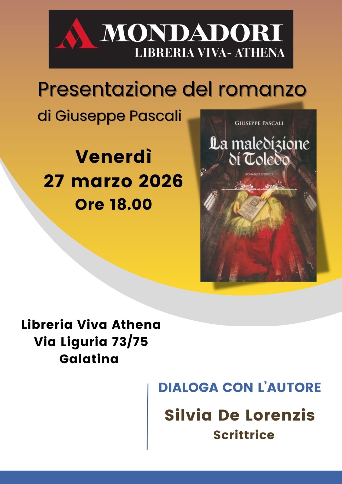 La Libreria Viva Athena di Galatina ospiterà venerdì 27 marzo 2026, alle ore 18.00, la presentazione del romanzo La maledizione di Toledo di Giuseppe Pascali, un’opera intensa che intreccia ricostruzione storica e narrazione avvincente. Ambientato nella Spagna del Seicento, nel pieno dell’Inquisizione, il romanzo conduce il lettore nei borghi della Navarra, tra Zugarramurdi e Urdax, luoghi segnati da una violenta caccia alle streghe culminata nel celebre autodafé di Logroño del 1610. In questo clima di paura, superstizione e delazioni, prende forma una vicenda carica di tensione, in cui il potere religioso si intreccia con storie umane di ingiustizia e persecuzione. Al centro della narrazione vi è la figura del cardinale Bonifacio Medina, tormentato da una maledizione lanciata da una donna condannata al rogo, e il destino di Isabel, giovane accusata ingiustamente di stregoneria. Due percorsi destinati a incrociarsi in un confronto carico di significato, che rappresenta il cuore del romanzo.