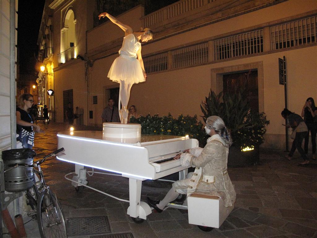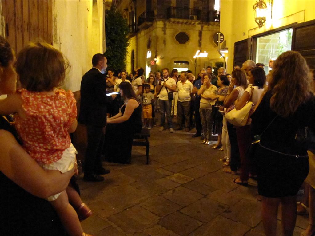 Il carillon vivente instancabile va da piazzetta Orsini a piazza San Pietro. Percorre via Umberto I, via Vittorio Emanuele II, via Garibaldi e lascia a bocca aperta. Le bambine guardano e sognano. La Notte della Cultura, mentre scriviamo, è ancora giovane. Il jazz sta per conquistare i palchetti. I pianoforti distribuiti lungo il percorso non restano mai muti. Anche l’arpa in piazzetta San Salvatore raccoglie un folto gruppo di curiosi e appassionati. I bambini hanno lasciato il grande gioco dell’oca allestito davanti al Municipio.. Il Sindaco passa e sorride probabilmente pensando a quando tocca a lui lanciare i dadi sul tavolo di Palazzo Orsini. Sorride anche Daniela Vantaggiato, assessore alla Cultura, mentre osserva un’improvvisata ballerina di appena 20 mesi. Gigi Rigliaco gira come una trottola e raccoglie tanti plausi e solo qualche sporadico mugugno di chi pensava di abbuffarsi ad una sagra ed invece ha incontrato la poesia. Come quella dei merletti appesi da Luisa Vozza ai fili tesi in un cortile, d'incanto trasformato in luogo di sogni.