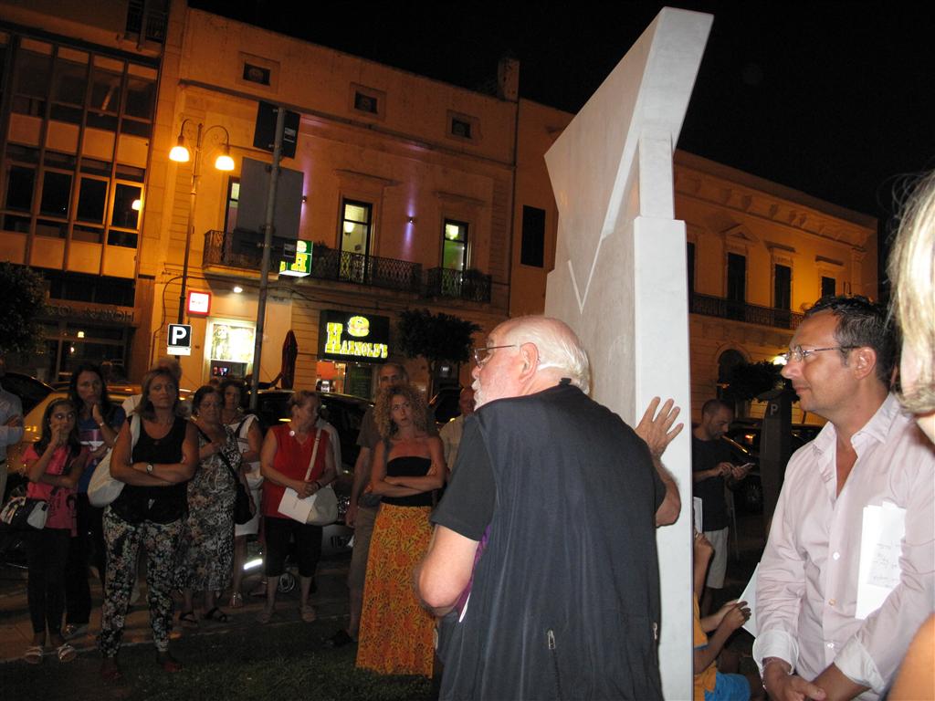 “La Civetta di Nico Preste –si legge nella sua presentazione dell’opera inserita nel libretto illustrativo distribuito nel corso della cerimonia - ben oltre essere una presenza urbana tangibile in dialogo costante con quanto la circonda, non ultima la ‘Lampada senza luce’ di Gaetano Martinez, e con il diuturno movimento ad esso connesso, sarà anche un qualcosa in cui potersi imbattere anche nella dimensione privata e personale(…)”.