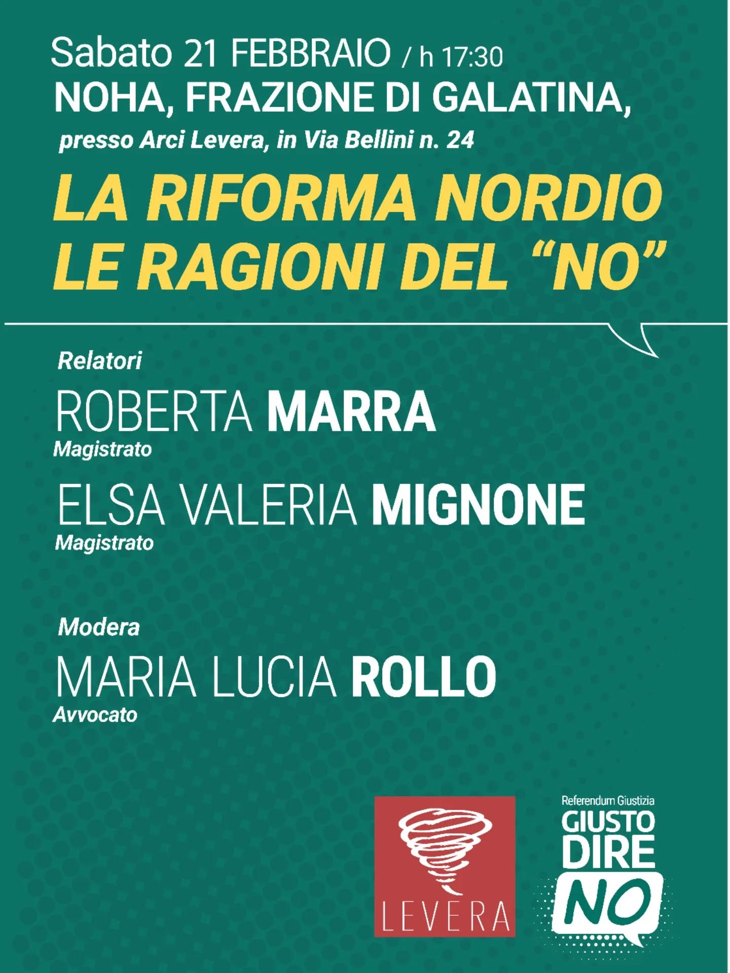 Il Comitato invita tutta la cittadinanza a partecipare al primo incontro pubblico: Sabato 21 febbraio 2026 – ore 17:30 Noha, frazione di Galatina presso Arci Levera, Via Bellini n. 24 “La Riforma Nordio – Le ragioni del NO”