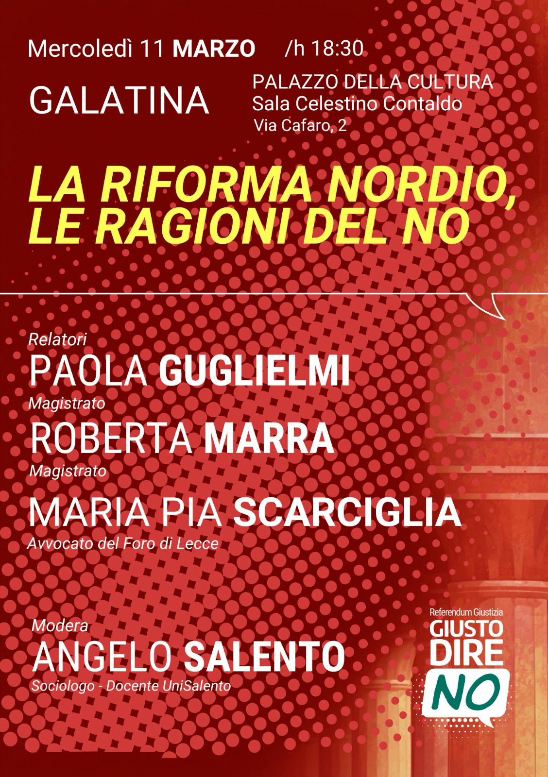 Il Comitato organizza un nuovo incontro pubblico dal titolo “La Riforma Nordio, le ragioni del NO”, con l’obiettivo di approfondire i contenuti della riforma e spiegare ai cittadini le motivazioni di chi ritiene necessario respingerla attraverso il voto. L’appuntamento è fissato per mercoledì 11 marzo alle ore 18:30, presso il Palazzo della Cultura di Galatina, nella Sala Celestino Contaldo (Via Cafaro 2).