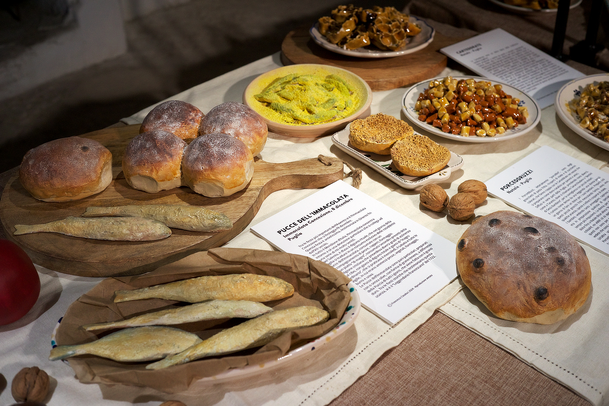 Tra le opere esposte spiccano il foggiano "Grano dei Morti", il "Pane di San Giuseppe" protagonista delle omonime “Tavole”, le "Pucce dell’Immacolata", i "Taràdde scatàt'" che impreziosiscono il Natale tarantino, i “Poperati” legati alle migrazioni dai Balcani, le "Fave di Sant'Antonio" ancora oggi distribuite intorno ai falò invernali.