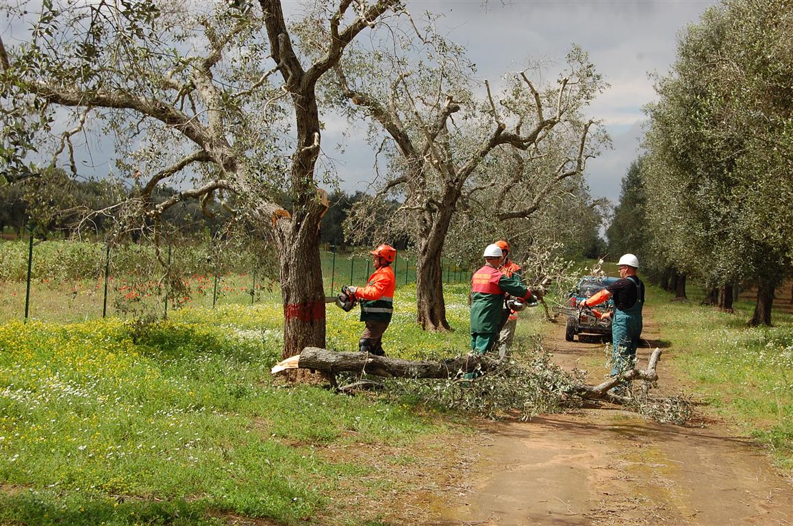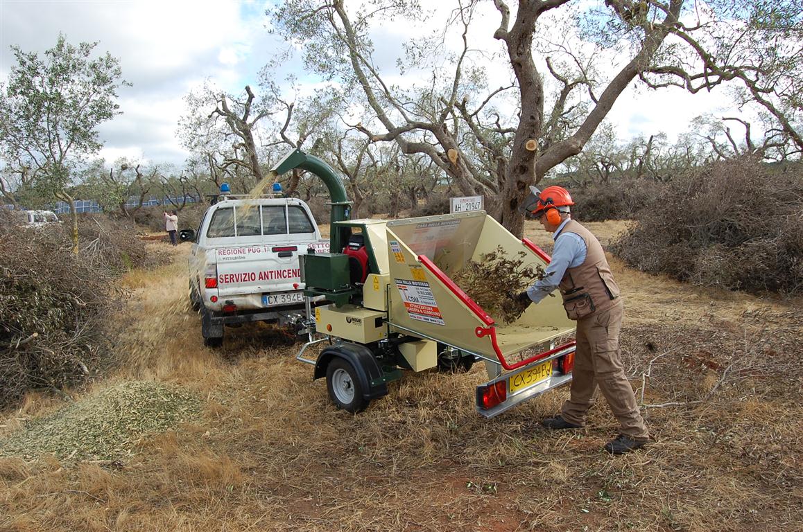 Trentacinque gli operai della sede leccese impegnati per alcuni giorni nelle operazioni, per le quali sono stati affittati da aziende locali due escavatori cingolati, due macchine movimento terra gommate, una cippatrice (le altre due utilizzate erano già in dotazione all’Agenzia), un trattore con trincia. Tra le piante individuate come irreparabilmente colpite dal batterio ve ne erano due monumentali, per le quali si è al momento preferita, alla eradicazione totale, una potatura drastica.