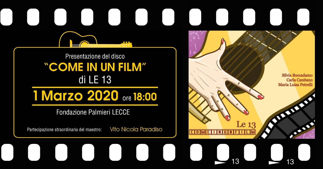 Silvia Boccadamo, Carla Canitano, Maria Luisa Petrelli in arte Le 13 presentano domenica 1 marzo 2020 a partire dalle 18:00 presso la Fondazione Palmieri a Lecce il loro nuovo album dal titolo “Come in un film”. Il secondo lavoro delle tre artiste è un album che comprende musiche di famosi compositori come Rota, Morricone, Piazzolla e Shostacovich, utilizzate come colone sonore e riarrangiate per la loro formazione in una versione intima, suggestiva e delicata. All’interno del disco in prima incisione assoluta è anche presente l’evocativo trittico “Travel in America”, composto dal noto chitarrista, didatta, compositore Vito Nicola Paradiso, autore del metodo per chitarra più diffuso in Italia e concertista di fama internazionale, che ha registrato il brano suddetto in quartetto con le artiste. Il centro nevralgico dell’evento di lancio sarà Fondazione Palmieri di Lecce alle ore 18:00, e sarà una vera e propria Immersive Experience che permetterà al pubblico di attraversare letteralmente la storia del cinema con le musiche di leggendarie di pellicole che nel corso dei decenni sono diventati capolavori. Il nuovo progetto discografico delle tre donne musiciste è già online su tutte le piattaforme streaming, ma hanno deciso di celebrare il primo ascolto con una grande festa che coincide con l’uscita ufficiale e si traduce in un’occasione di incontro, osservazione e condivisione.