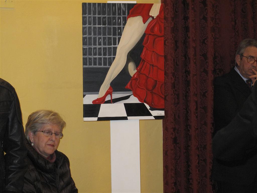Si stringono in un tango appassionato e fanno sognare i presenti. Stefania Filograna e Pino Belgioioso catturano uomini e donne e e quasi li trascinano nel vortice delle volute dei loro perfetti passi di danza. Viene istintivo alzare gli occhi e guardare le tele appese alle pareti della bella sala di Palazzo Baldi. Le 'Passioni' trasmesse dai ballerini sembrano condensarsi su quelle immagini che le pennellate di Paola Scialpi hanno raccontato con i rossi, i neri e i bianchi. La pittrice leccese se ne sta timida sotto la tela che è anche il manifesto della mostra e poi ascolta Stefano Donno mentre parla della 'grande artista internazionale'.