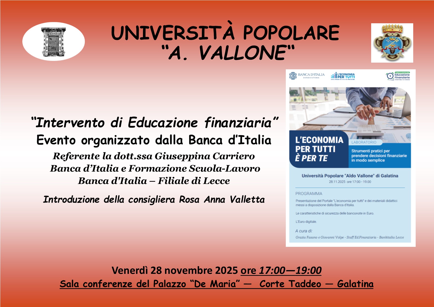 Oggi venerdì 28 novembre 2025 alle ore 17:00, nella Sala conferenze dell’ex Palazzo De Maria, in Corte Taddeo, l’Università Popolare “Aldo Vallone” ha aderito ad un’iniziativa laboratoriale della filiale di Lecce della Banca d’Italia per cui si terrà un incontro dal titolo “L’economia per tutti è per te. Strumenti pratici per prendere decisioni finanziarie in modo semplice”.