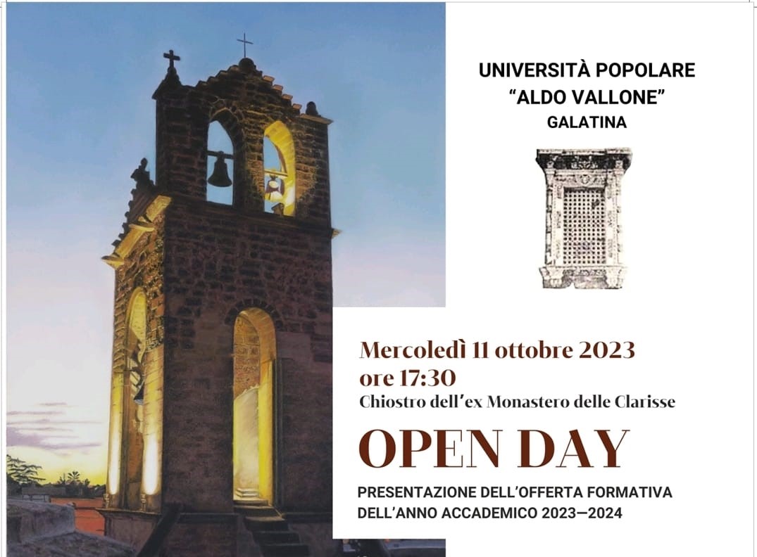 Riprenderanno oggi mercoledì 11 ottobre 2023, alle ore 17:30, nel Chiostro dell’ex Monastero delle Clarisse, le attività dell’UNIVERSITA’ POPOLARE “Aldo Vallone” con il tradizionale OPEN DAY di presentazione dell’offerta formativa.