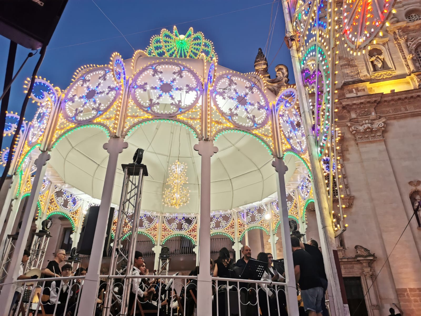 Gli alunni del corso a indirizzo musicale della scuola secondaria di primo grado, straordinariamente diretti e guidati con competenza e professionalità dai Maestri Maria Rita Apollonio (pianoforte), Luisa Augusti (flauto), Graziano Caiuli (chitarra) e Gianfranco Schirinzi (violino), hanno allietato i presenti con un variegato repertorio di brani (La vita è bella, Stand by me, Billie Jean, Mamma Mia e Lu rusciu te lu mare), esibendosi sulla cassa armonica in piazza San Pietro.