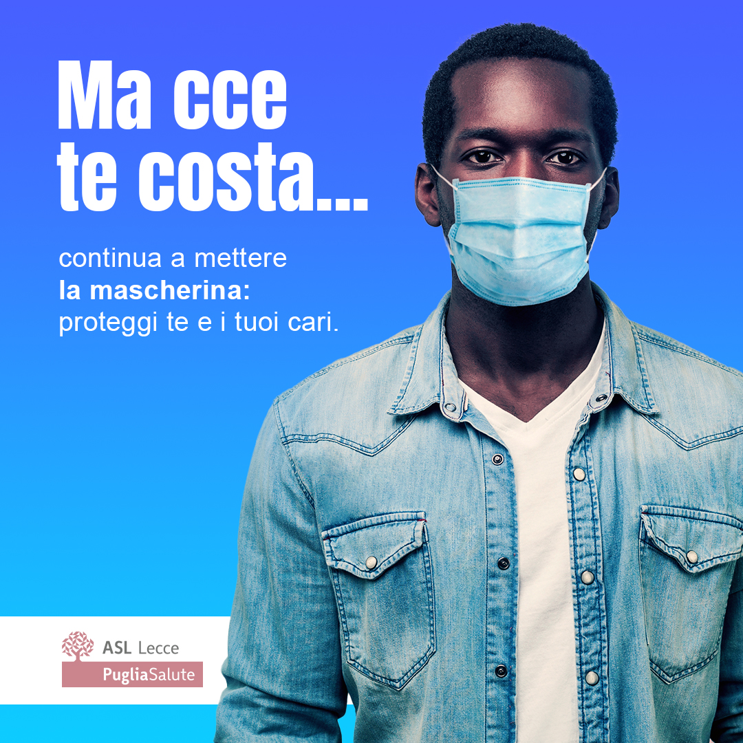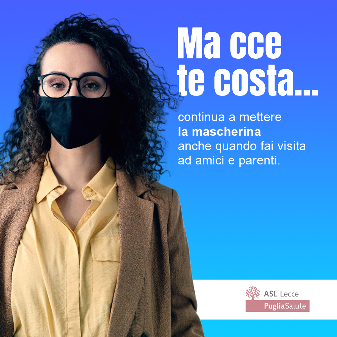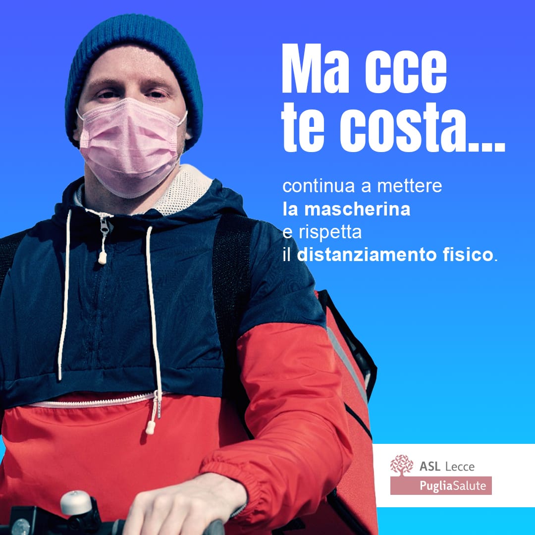 ASL Lecce lancia una campagna di comunicazione per il corretto uso della mascherina con il claim dialettale 'Ma cce te costa' declinato su 4 immagini diverse per richiamare l'attenzione, dei più giovani in particolare, sull'importanza dell'utilizzo del più diffuso dispositivo di protezione individuale nelle occasioni più comuni della vita quotidiana: la visita ai parenti, agli amici, la spesa in un negozio. Una campagna rivolta al nostro territorio e al contempo a disposizione di tutti, che sarà pubblicata sul portale istituzionale e sulla pagina facebook di Asl Lecce.