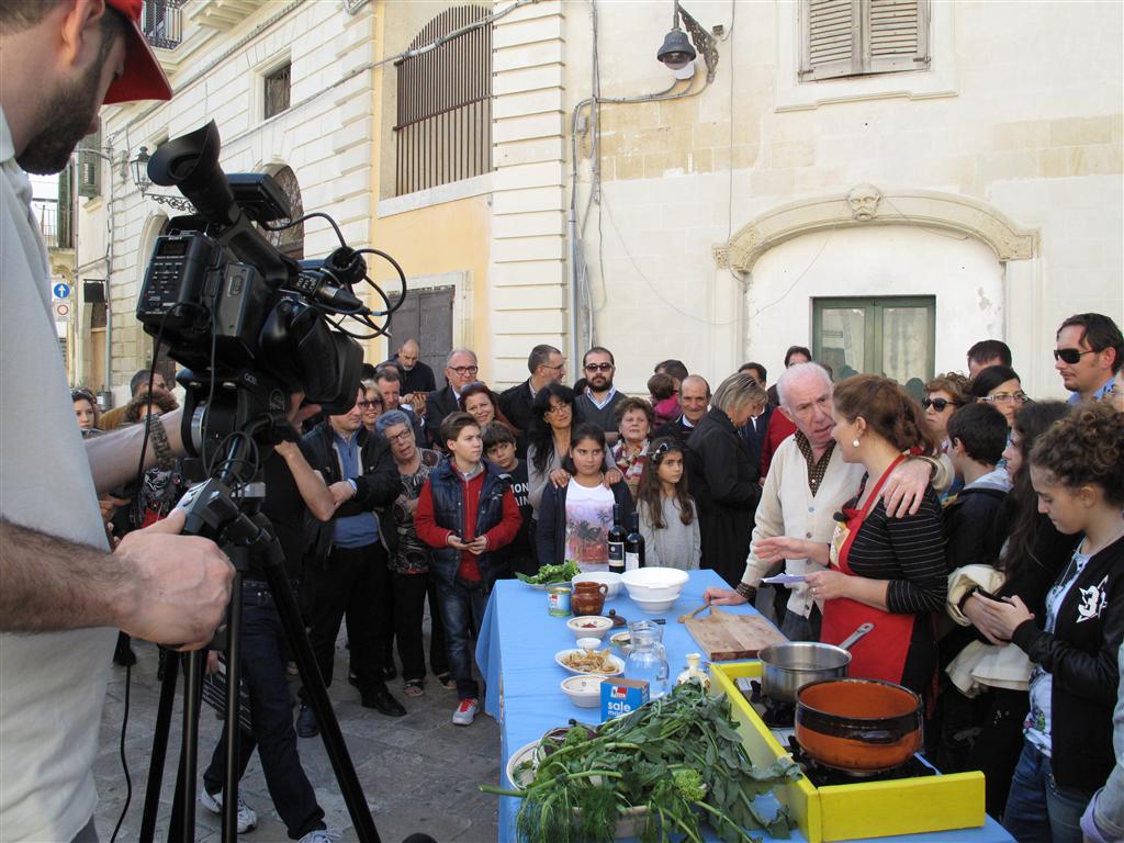 I piatti di Anima e Core e i dolci di Eros Bar sono stati offerti, nel primo pomeriggio, in piazza San Pietro insieme al “pane dei poverieddri” e allo “squaiatu” di Santino Beccarisi che ha, poi, mostrato come si spacca una frisa con lo spago (Mengacci si è detto incapace a farlo) e come la si bagna e la si condisce con olio, sale e pomodoro. . Non è mancata una parola per la patata di Galatina.