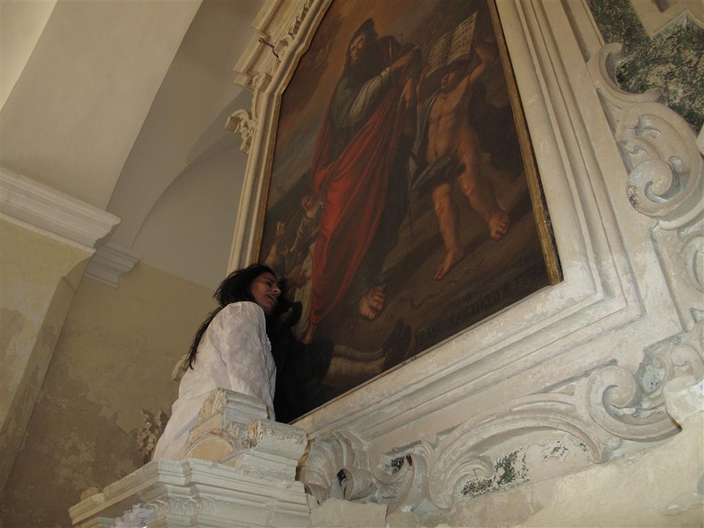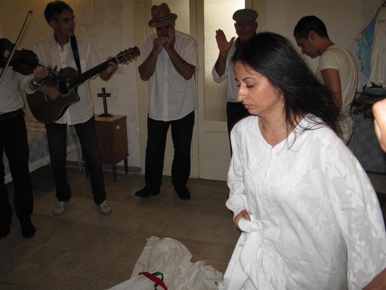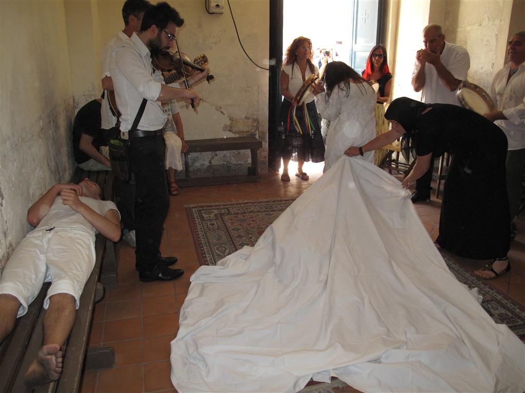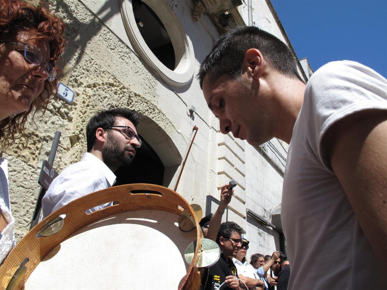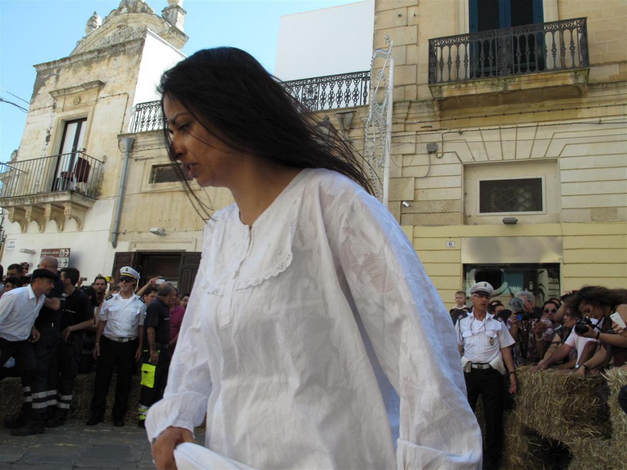 Simona Indraccolo, sempre più brava nell’interpretare il ruolo della pizzicata, si è arrampicata anche sul misero altare (ormai si va sbriciolando ogni giorno di più) e i suoi urli si sono uditi anche dalla strada. Quando lascia, accompagnata da i suoi due colleghi (Deborah Campa e Domenico Spagnuolo) e dai musicanti, la chiesetta di Palazzo Tondi-Vignola gli applausi esplodono scroscianti. “Io ho viste quelle vere” –dice una delle almeno duemila persone che hanno invaso, fino a mezzogiorno di ieri, via Garibaldi.