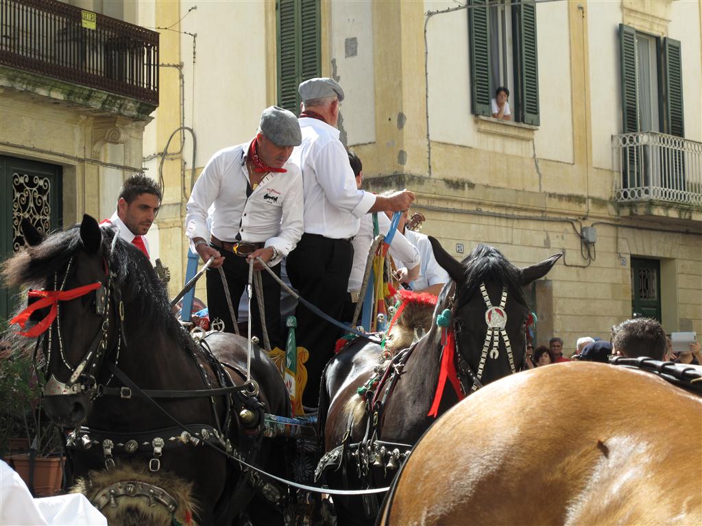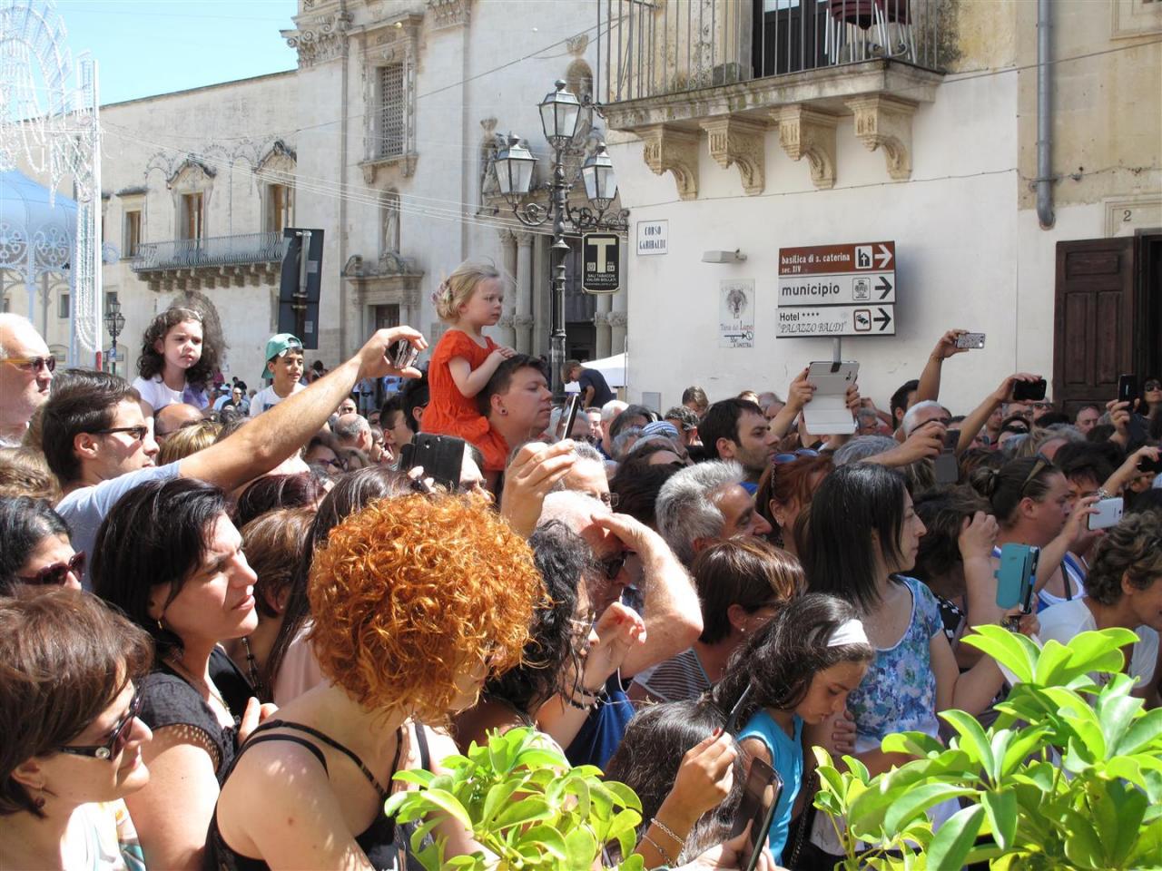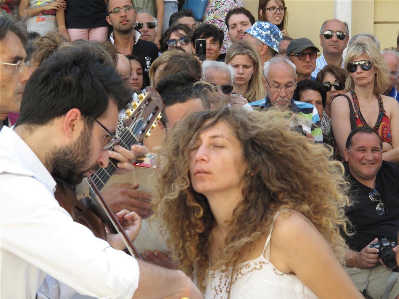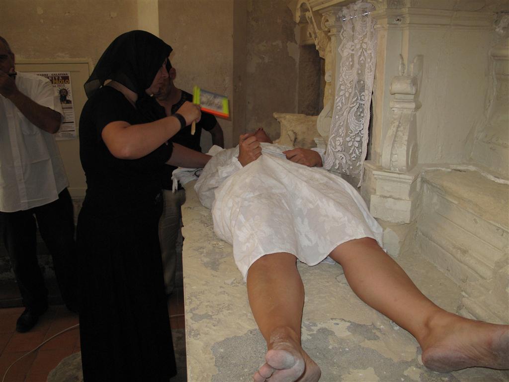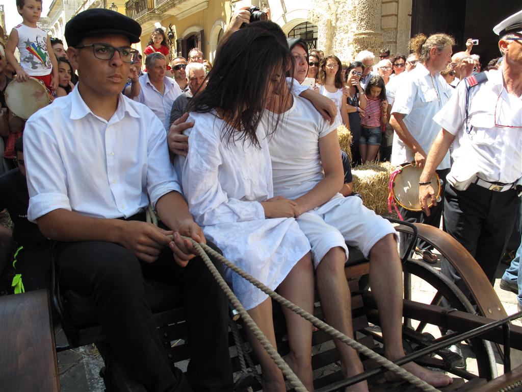 Simona Indraccolo, sempre più brava nell’interpretare il ruolo della pizzicata, si è arrampicata anche sul misero altare (ormai si va sbriciolando ogni giorno di più) e i suoi urli si sono uditi anche dalla strada. Quando lascia, accompagnata da i suoi due colleghi (Deborah Campa e Domenico Spagnuolo) e dai musicanti, la chiesetta di Palazzo Tondi-Vignola gli applausi esplodono scroscianti. “Io ho viste quelle vere” –dice una delle almeno duemila persone che hanno invaso, fino a mezzogiorno di ieri, via Garibaldi.