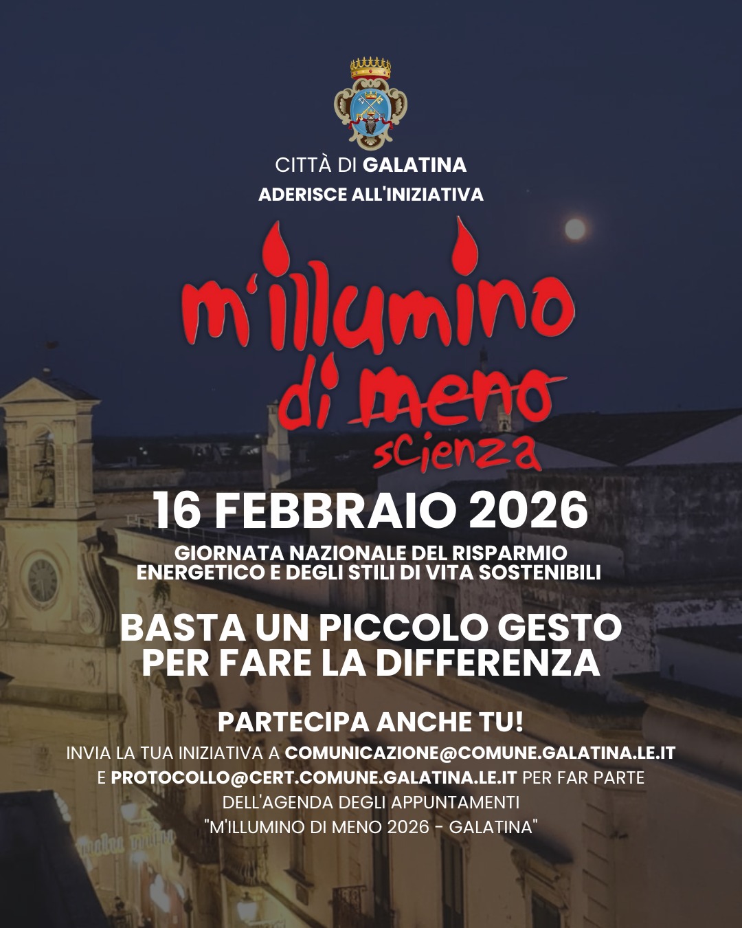 La Città di Galatina, anche quest’anno aderisce, per il 3° anno consecutivo, all’iniziativa “M’Illumino di Meno”, nata all’interno della trasmissione radiofonica Caterpillar e promossa da Rai Radio2, che giunge alla XXII edizione e pone al centro il tema della Scienza come elemento per ridurre gli sprechi energetici.