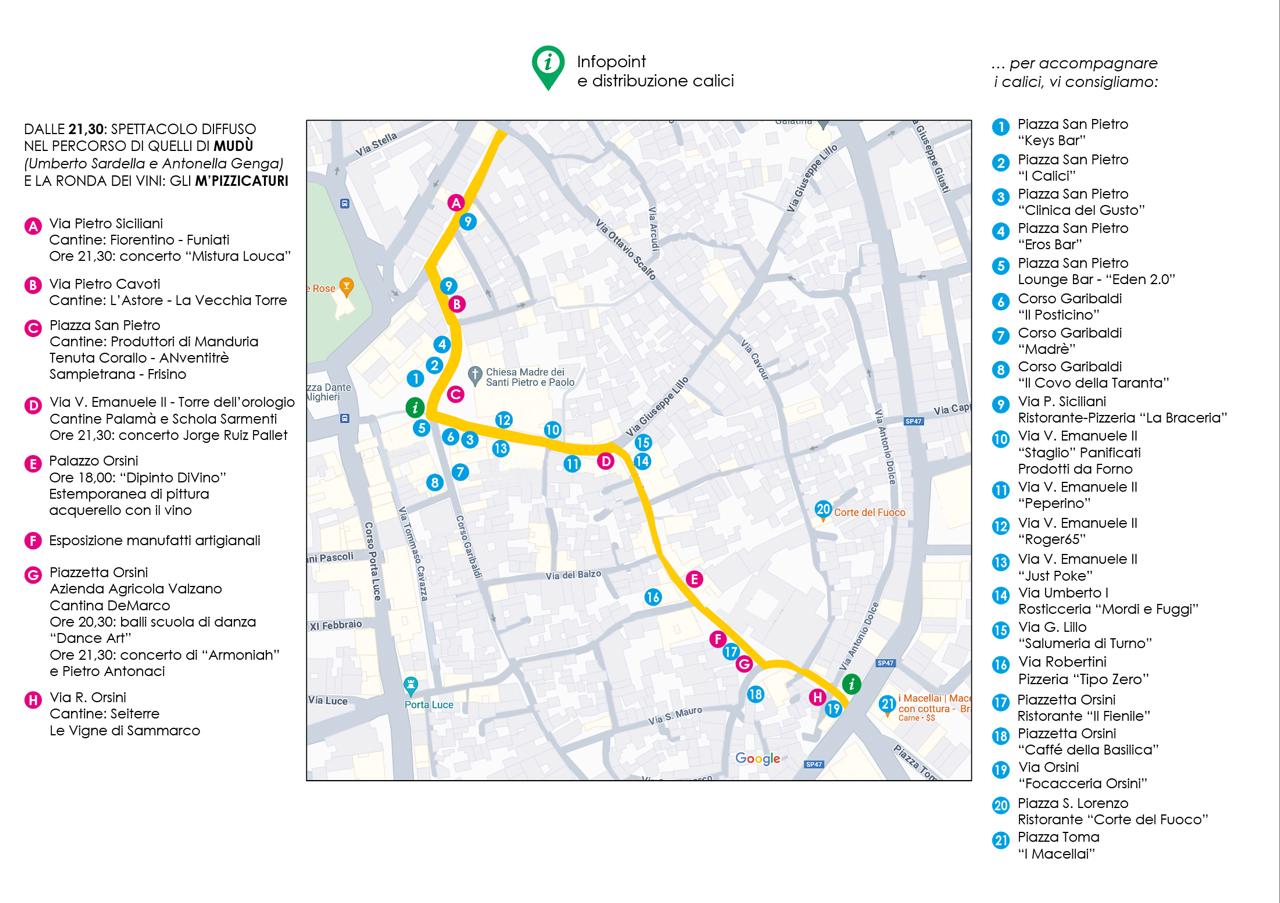 Con inizio alle ore 21 e per tutta la sera il centro storico con i suoi monumenti nazionali e favolosi Palazzi aperti sarà allietata da più generi musicali, il Rock e il Jazz dei Mistura Louca in via Siciliani, la musica cubana e caraibica di Jorge Ruiz Pallet sotto la torre dell’orologio in via Vittorio Emanuele ll e la musica leggera, il pop degli Armoniah con Piero Antonaci in piazzetta Orsini. Ci sarà la Ronda del Vino con gli "Mpizzicaturi" che si muoveranno in tutto il percorso a ritmo di pizzica. Spettacolo diffuso di quelli di Mudú, Umberto Sardella e Antonella Genga che con i loro interventi allieteranno la serata, per qualche sorriso in più.