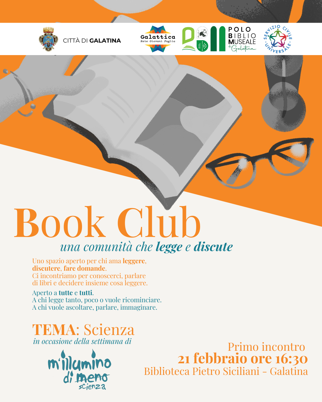 Il primo incontro si terrà venerdì 21 febbraio 2026 alle ore 16:30 presso la Biblioteca Pietro Siciliani, in Piazza Alighieri 51, Galatina. Il Book Club nasce come sprono per una comunità che legge e discute, uno spazio inclusivo per chi ama i libri, le domande e il confronto. Un luogo pensato per conoscersi, parlare di libri e decidere insieme cosa leggere, valorizzando il dialogo e la pluralità di punti di vista. Il tema della scienza, al centro del primo incontro, permetterà di collegare lettura, sostenibilità e scelte consapevoli, in piena sintonia con i valori di M’Illumino di Meno. Un primo passo per leggere insieme il presente e immaginare il futuro. L’ingresso è libero, ma è obbligatoria la registrazione al seguente link: https://forms.gle/KotVHXsMSBKAWKvV9