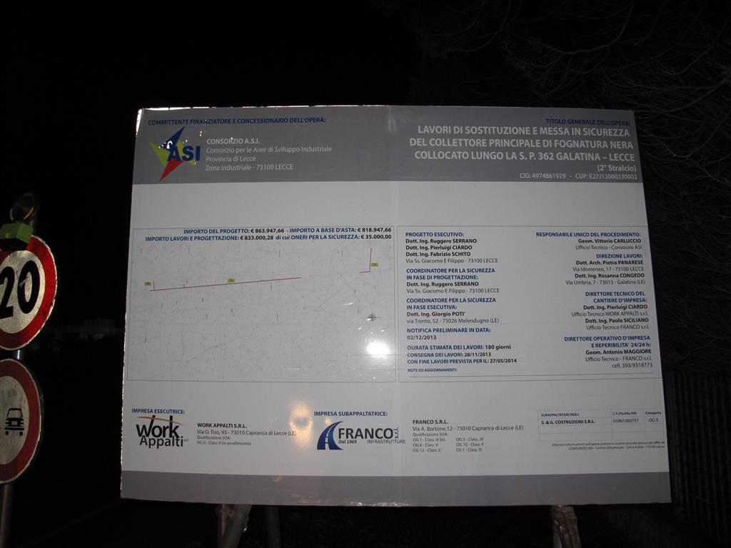 Alle ore 10:30 di ieri mattina ho segnalato alle autorità competenti una situazione di pericolo sulla deviazione della ex-Strada Provinciale 362. Alle ore 19 di ieri sera nessun intervento era stato fatto e, quanto era facilmente prevedibile, era già probabilmente accaduto. L'azienda che sta eseguendo i lavori di sostituzione delle condotte di fognatura nera lungo la Galatina - Lecce ha, ieri, deviato il traffico su una complanare a sinistra in direzione del capoluogo. Chi ha avuto la ventura di imboccare quella strada, si è trovato immediatamente davanti un tombino segnalato da tre tondini di ferro da costruzione alti circa 70 centimetri su cui erano stati maldestramente legati tre pezzettini di nastro bianco e rosso. Percorsi circa trenta metri sulla sinistra si vedevano spuntare altri tre tondini che delimitavano un altro tombino.