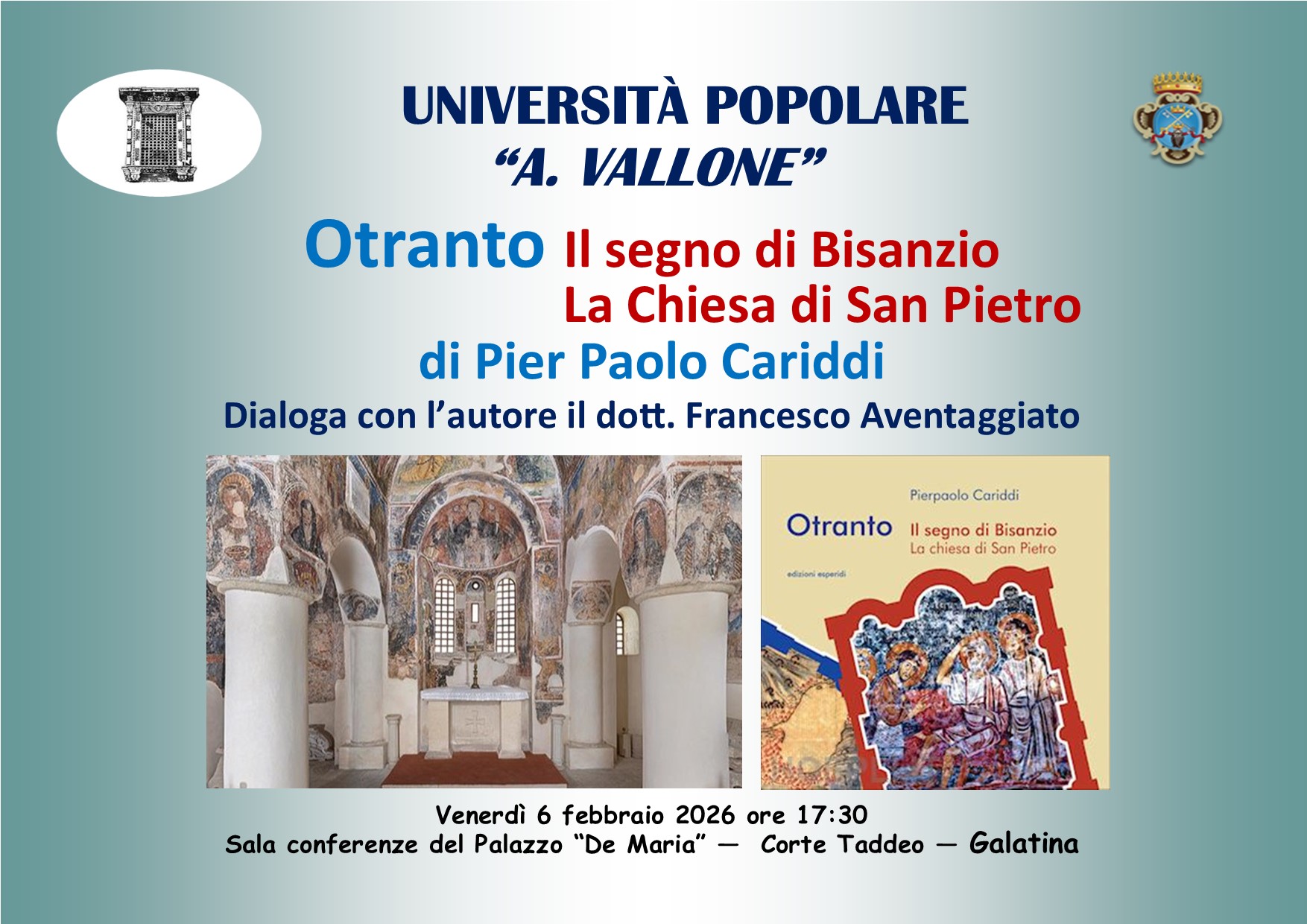 Oggi venerdì 6 febbraio 2026 alle ore 17:30, nella Sala conferenze dell’ex Palazzo De Maria, in Corte Taddeo, l’Università Popolare “Aldo Vallone” ha in programma l’ultima delle tre lezioni del Corso su argomenti di storia medioevale relativi al nostro territorio.
