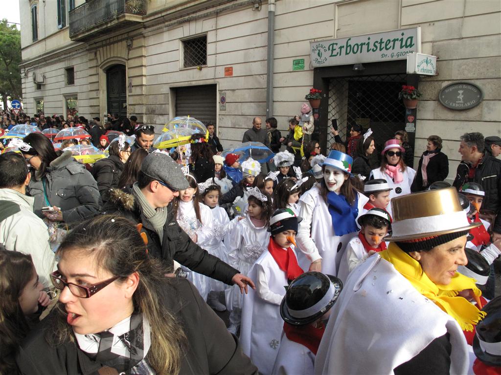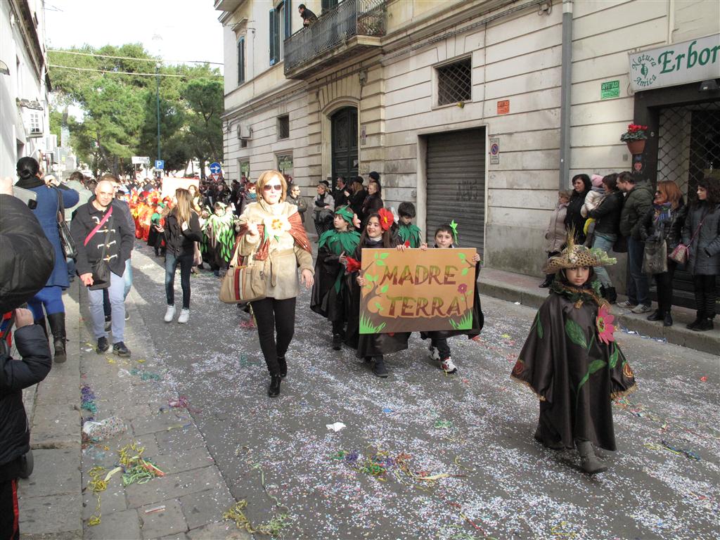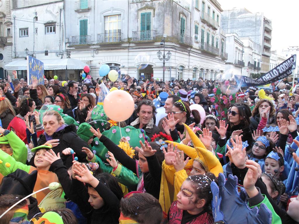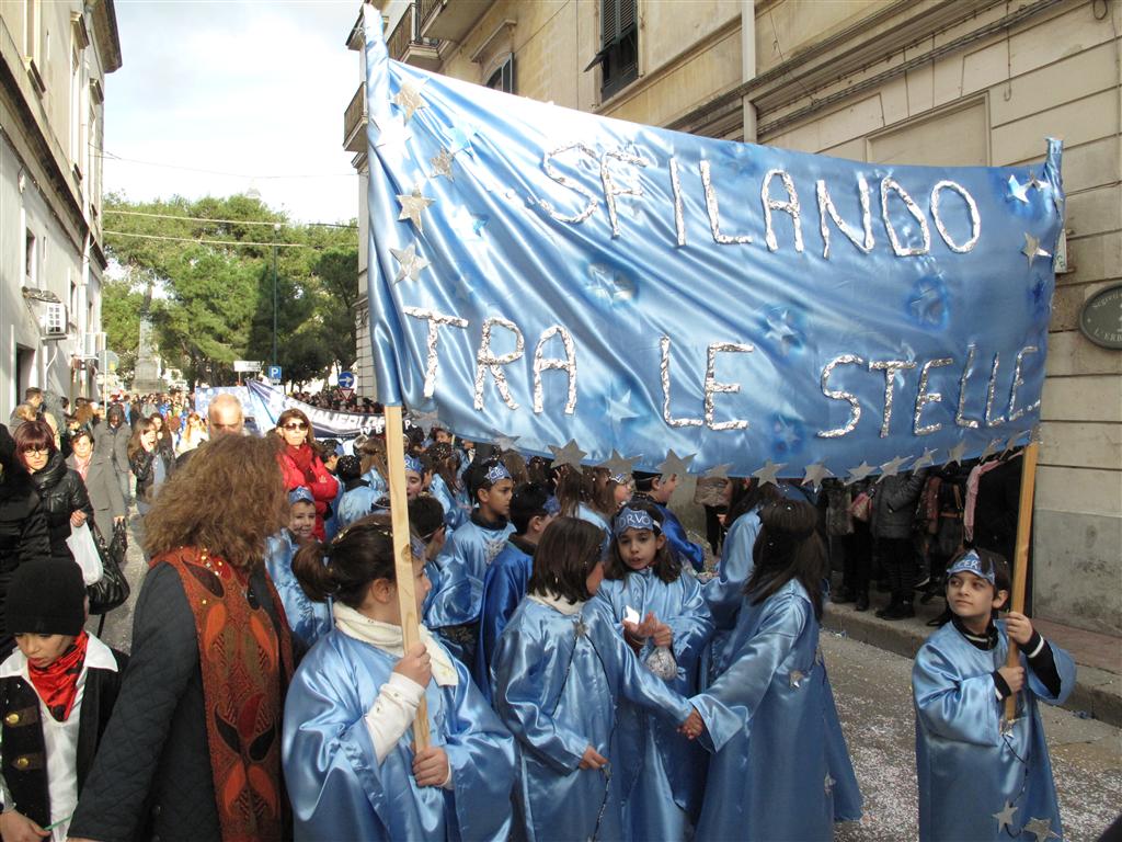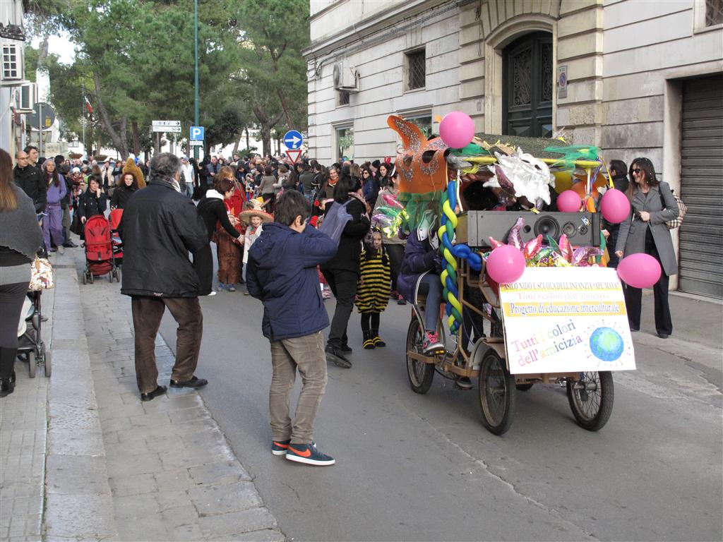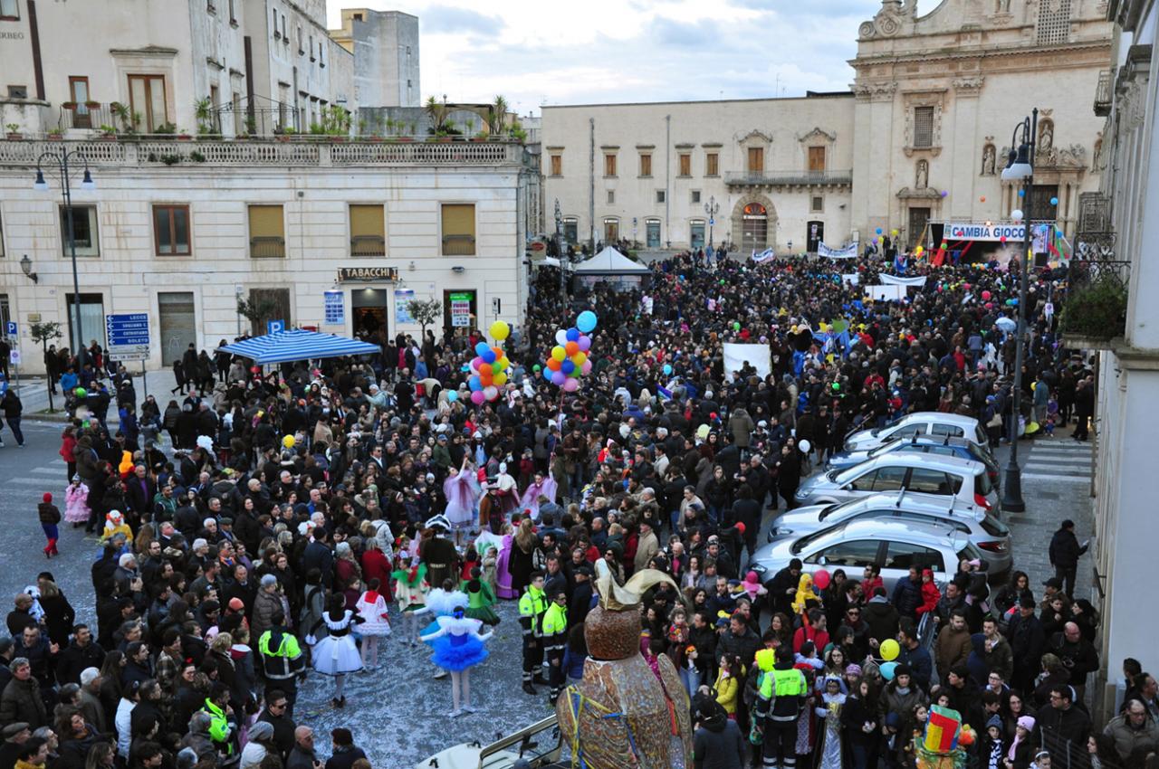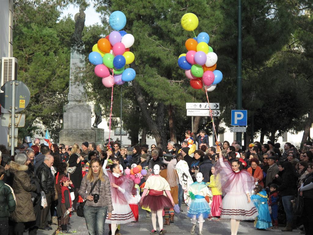 Almeno ottomila persone hanno riempito, ieri, Piazza San Pietro per festeggiare il ritorno del Carnevale galatinese. I bambini dei tre Poli hanno donato la loro gioia, i loro colori, la loro allegria ad una Città che ne ha proprio bisogno. Il Mago Fracasso ha ringraziato le maestre e l’applauso si è levato fragoroso da tutta la piazza. “Semel in anno licet insanire (Una volta all’anno è consentito fare pazzie)” – ha ricordato Daniela Vantaggiato, assessore alla cultura, rigorosamente mascherata da dama veneziana, accompagnata da un irriconoscibile Alberto Russi. Sotto un elegante abito di plastica riciclata Maria Rosaria Romano, ex-assessore ai servizi sociali, ha sottolinea il messaggio che i frequentatori del Centro Diurno, guidati da Natalino De Paolis, hanno voluto lanciare: “Non siamo da buttare. E allora ricicliamo”.