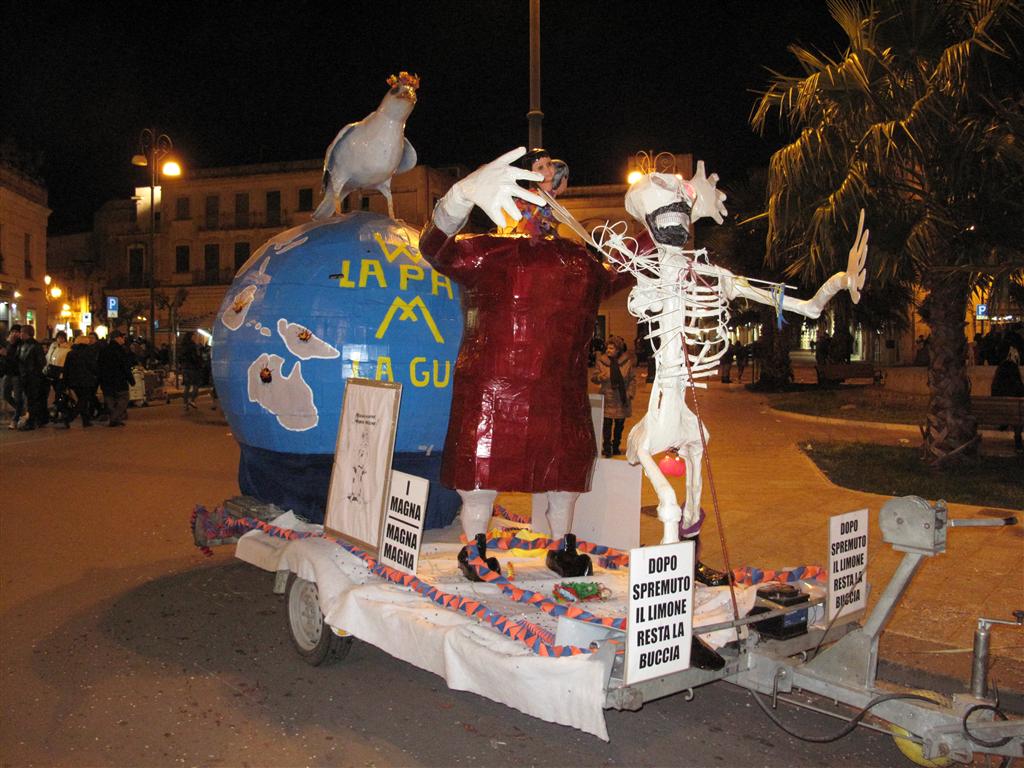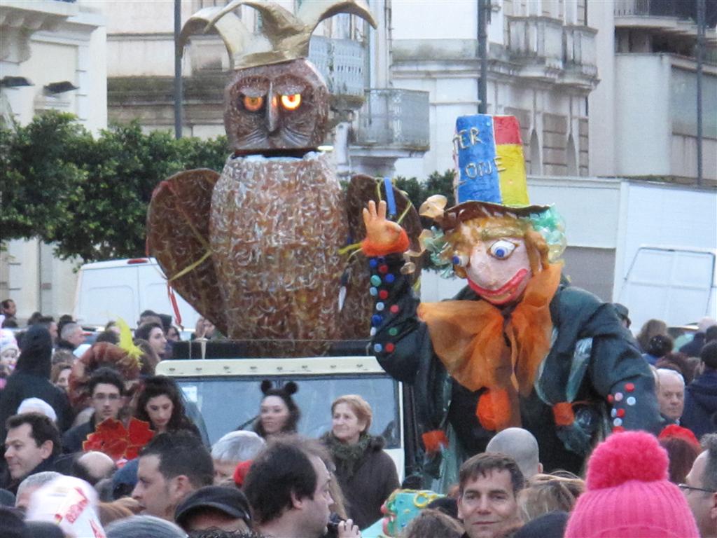 Gaetano De Matteis, infaticabile animatore del Carnevale galatinese, ha osservato a lungo da lontano sotto la ‘sua’ civetta in cartapesta. “Costa molta fatica e denaro ma dà soddisfazione” –dice e non perde l’occasione per elencare con nome e cognome chi ha lavorato ai carri (cinque dedicati alla politica nazionale e locale, con uno funebre allestito a Collemeto) e all’organizzazione (qui l’intervista).