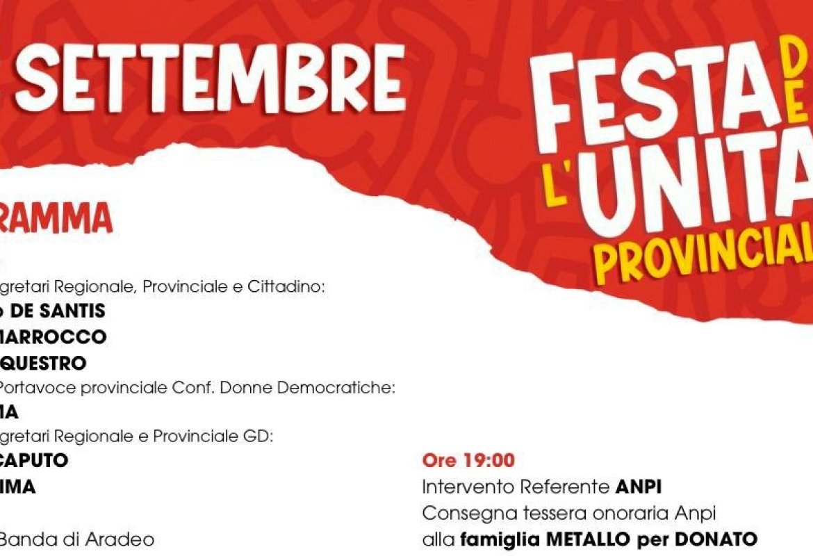Dal 12 al 14 settembre 2025, in Piazza Cesare Battisti a Nardò, tornerà la Festa de l’Unità provinciale del Partito D