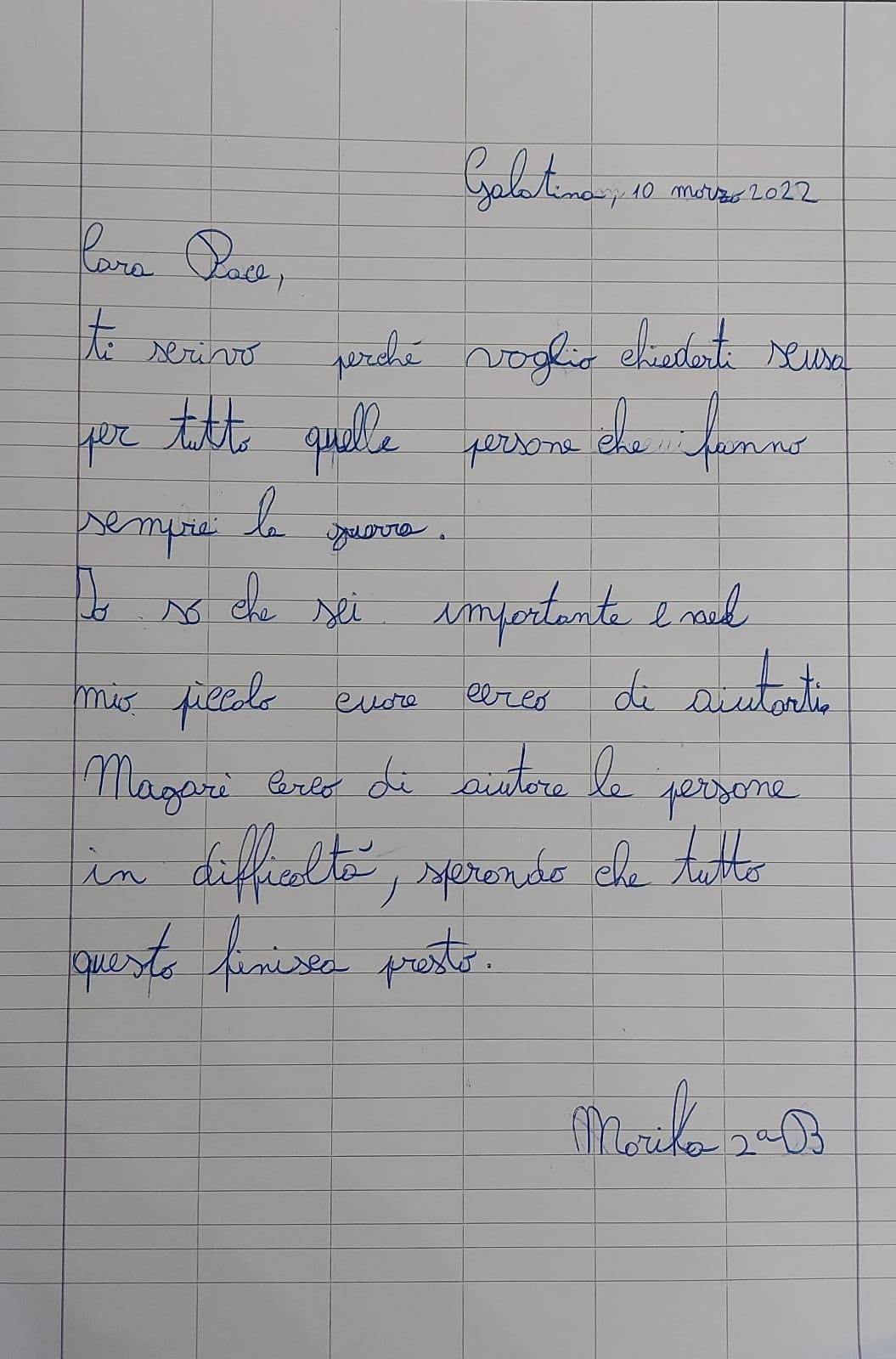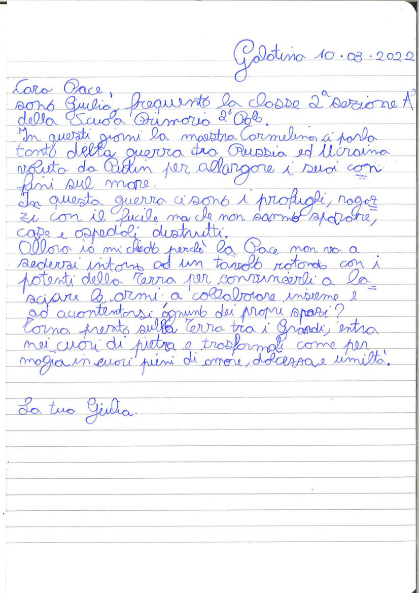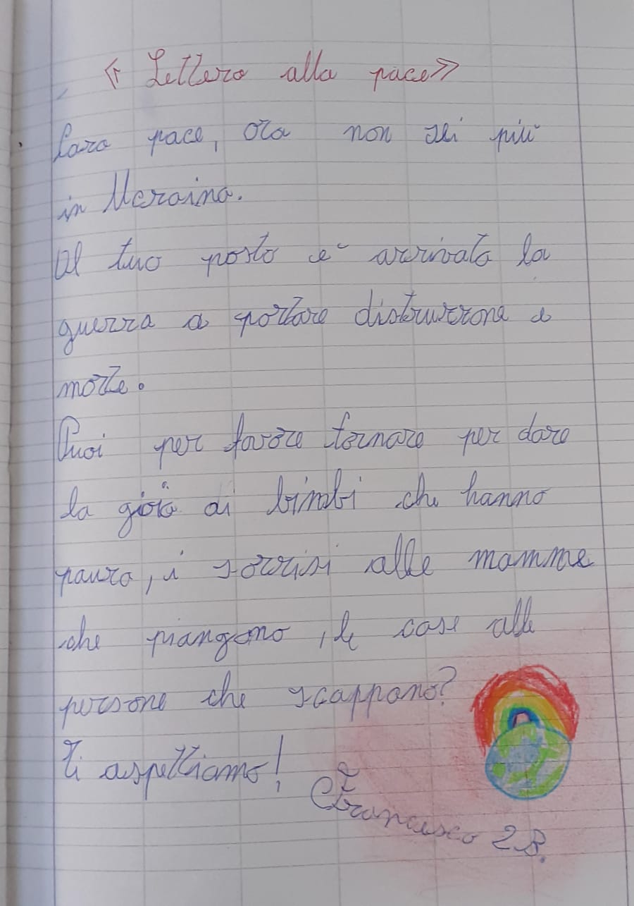 In questi ultimi giorni, bambini e ragazzi, purtroppo, si trovano di fronte ad immagini di guerra, rappresentazioni per loro inspiegabili, per le quali non hanno i mezzi appropriati per comprenderle. La nostra scuola, da sempre, è stata attenta e partecipe alla vita sociale e si è fatta promotrice di diverse iniziative, avendo come fine ultimo solo quello della sensibilizzazione degli alunni alle problematiche attuali, sempre nell’ottica di una cultura della Pace.