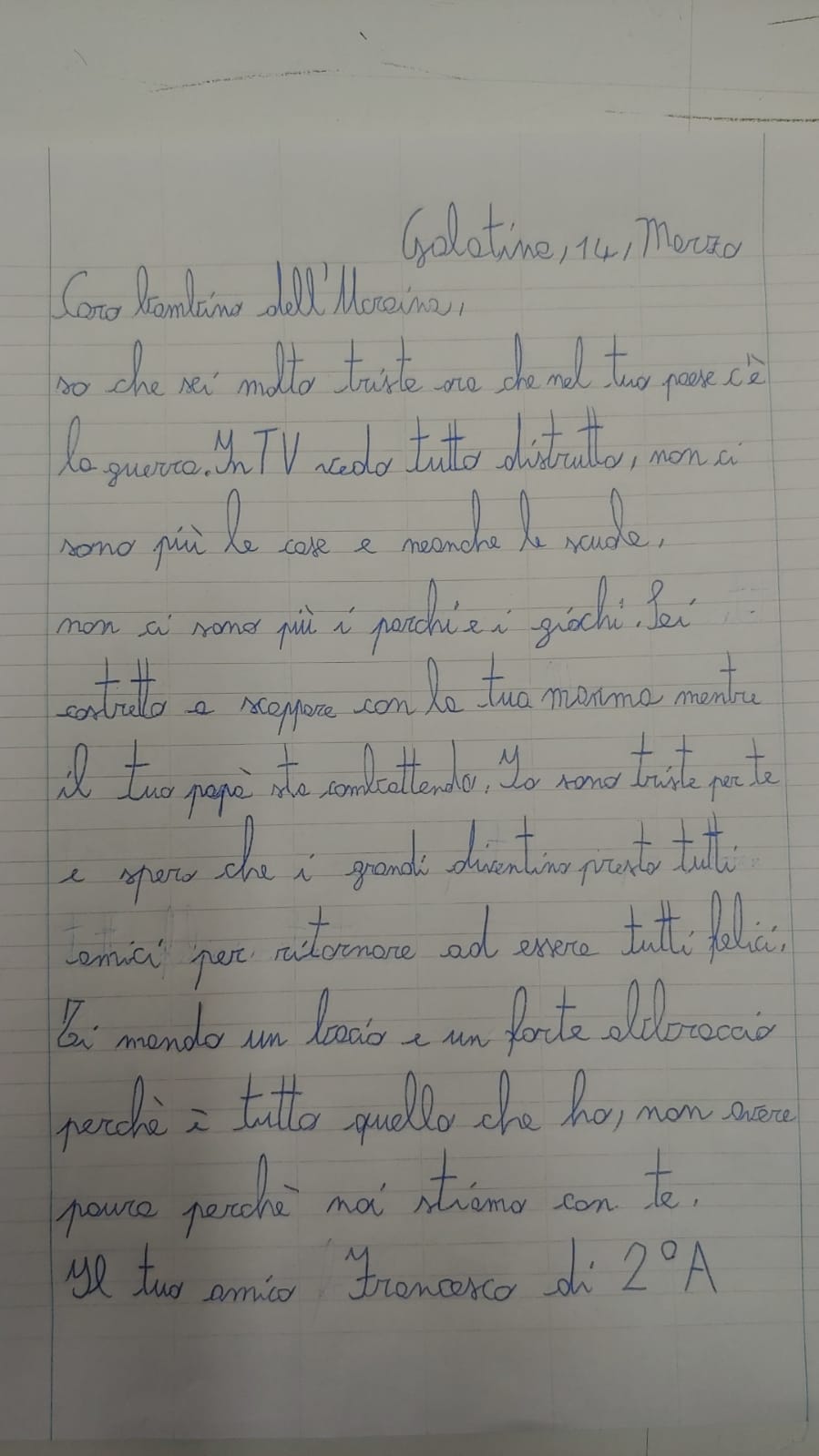 Si è cercato di far conoscere bisogni, difficoltà, sofferenze per comprendere che sono superabili e che è possibile uscirne solo con l’annientamento degli egoismi personali. Così, partendo da una collocazione storico-geografica delle due nazioni, Russia e Ucraina, abbiamo lavorato in un percorso multidisciplinare che, attraverso storie, racconti, filastrocche, lettere personali ed elaborati grafico-pittorici ha cercato di contestualizzare il conflitto nella quotidianità dei bambini, senza banalizzarlo.
