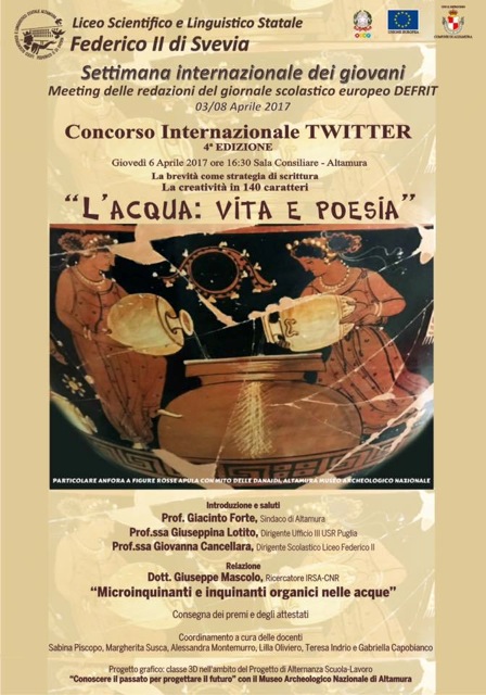 Lo scorso 6 aprile Vanessa Rizzello della classe III C del Liceo Artistico “P. Colonna” di Galatina è stata premiata nell’ambito del concorso internazionale di scrittura creativa “La brevità come strategia di scrittura. La creatività in 140 caratteri: Twitter”, quarta edizione, indetto dal Liceo Scientifico e Linguistico “Federico II di Svevia” di Altamura. La studentessa ha meritato il terzo premio per il suo tweet inerente al tema proposto: “L’acqua: vita e poesia”.