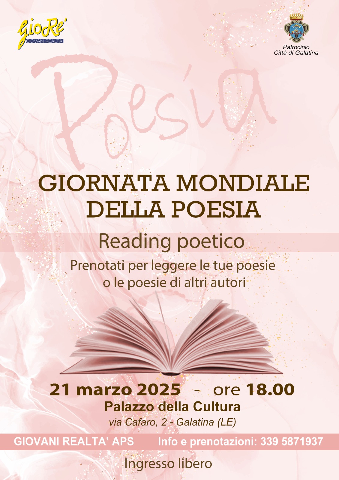 In occasione della Giornata mondiale della poesia, il 21 Marzo 2025, alle ore 18, nella sala “C. Contaldo” si svolgerà il reading poetico organizzato dall’Associazione di Promozione Sociale Giovani Realtà con il Patrocinio della Città di Galatina.