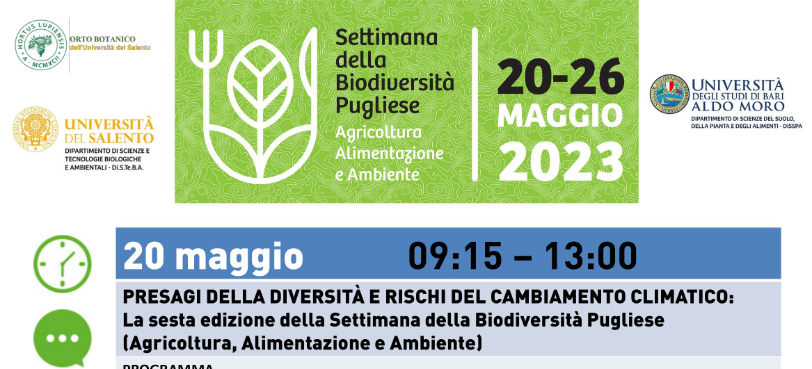Il Dipartimento di Scienze e tecnologie biologiche e ambientali (DiSTeBA) e l’Orto botanico dell’Università del Salento partecipano anche quest’anno alla “Settimana della biodiversità pugliese”, giunta alla sesta edizione e in programma dal 20 al 26 maggio 2023. I lavori si apriranno con il convegno “Presagi della diversità e rischi del cambiamento climatico: la sesta edizione della Settimana della biodiversità pugliese (agricoltura, alimentazione e ambiente)”: appuntamento sabato 20 maggio 2023 alle ore 9.15 nel centro congressi complesso Ecotekne (via per Monteroni, Lecce). Interverranno tra gli altri il Presidente della Società meteorologica italiana Luca Mercalli, il responsabile della biodiversità terrestre e gestione sostenibile dei sistemi agro-forestali di ISPRA e rappresentante nazionale di IPBES Lorenzo Ciccarese, il coordinatore dell’unità operativa dell’Università del Salento del National Biodiversity Future Centre Alberto Basset; il responsabile dei Progetti BiodiverSO Karpos e BiodiverSO Veg e curatore della Settimana della biodiversità pugliese Pietro Santamaria, il responsabile dei progetti sulla biodiversità che il DiSTeBA ha in carico in qualità di partner scientifico Luigi De Bellis. Sarà presentato inoltre in anteprima nazionale da Lorenzo Scaraggi il docufilm sui Biopatriarchi di Puglia, mentre le conclusioni saranno a cura di Luigi Trotta, dirigente Sezione Competitività delle Filiere Agroalimentari della Regione Puglia. Nel corso del convegno saranno allestite diverse esposizioni curate da agricoltori custodi, vivaisti, associazioni e artisti del territorio che da anni collaborano con il DiSTeBA UniSalento per la salvaguardia e valorizzazione della biodiversità agraria e ambientale. Per concludere, l’IISS “Presta-Columella” di Lecce curerà un’esposizione di pietanze locali, spiegando i principi agronomici e salutistici dei prodotti utilizzati. Dal 21 al 26 maggio Il DiSTeBA e l’Orto Botanico dell’Università del Salento parteciperanno alla Settimana della biodiversità con escursioni, laboratori didattici, attività sociali e gastronomiche e incontri culturali assieme ad associazioni, aziende agricole, vivaisti, Istituti scolastici e artisti locali. Programma dettagliato sul sito www.settimanabiodiversitapugliese.it