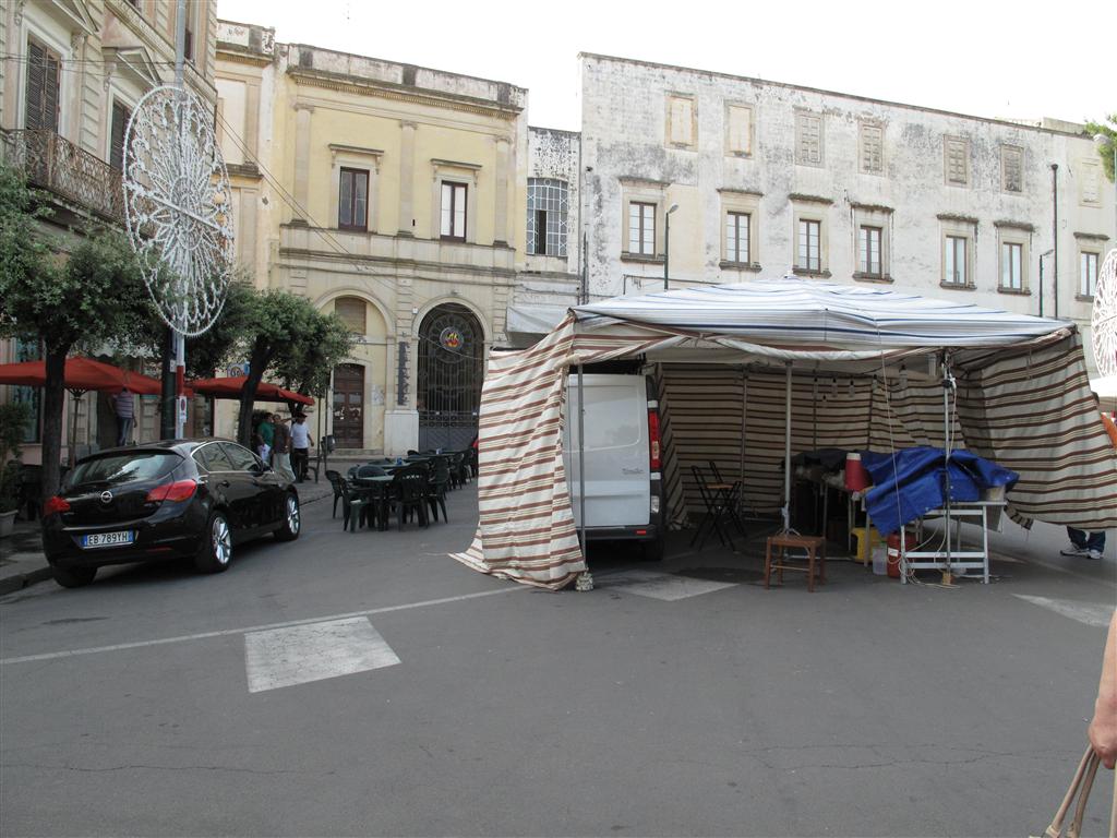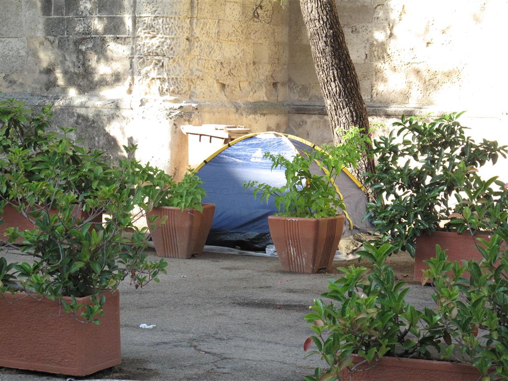 Il 29 giugno, alle ore 18, la tenda era una sola, a due passi dal busto di Pietro Siciliani davanti all’ingresso di Palazzo Rizzelli, provvisoria sede della 64ma Fiera di Galatina. Con pazienza il Vigile urbano si avvicinò per capire chi fosse il proprietario. Arrivò subito un ragazzo, probabilmente senegalese. In un attimo la smontò. “Ti prometto che domani mattina alle 8 non ci sarà più” –promise all’agente. Il giorno 30 alle ore 10:45 le tende erano tre (due montate ed una, sotto forma di telo, era appesa ad un albero). Lo stesso rappresentante della Polizia Locale arrivò e le fece smontare. I proprietari di quei miseri ripari per la notte erano giovani africani, venditori di oggetti etnici su due bancarelle poste all’inizio della ‘Festa’ su corso Re d’Italia. La stessa scena si ripetè in via Diaz sotto i portici.