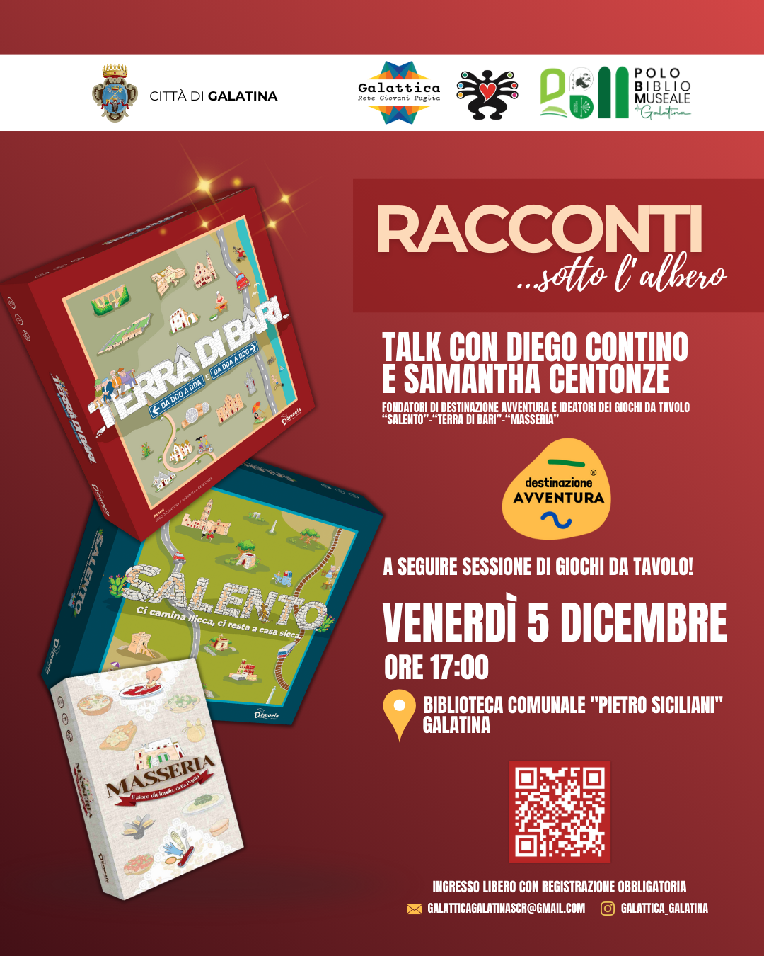 Il primo incontro sarà giovedì 5 dicembre 2025 alle ore 17.00, presso la Biblioteca comunale di Galatina, e avrà due ospiti d’eccezione: Diego Contino e Samantha Centonze, ideatori di Destinazione Avventura e autori dei giochi da tavolo “Salento”, “Masseria” e “Terra di Bari”.