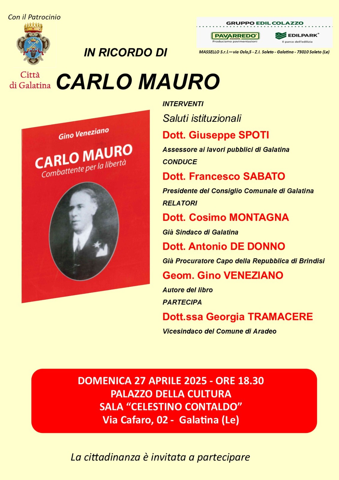 Galatina Eventi 26 Apr 2025 / 0 Comments In ricordo di Carlo Mauro di l.v. Sabato, 26 Aprile, 2025 - 00:00 Articoli correlati