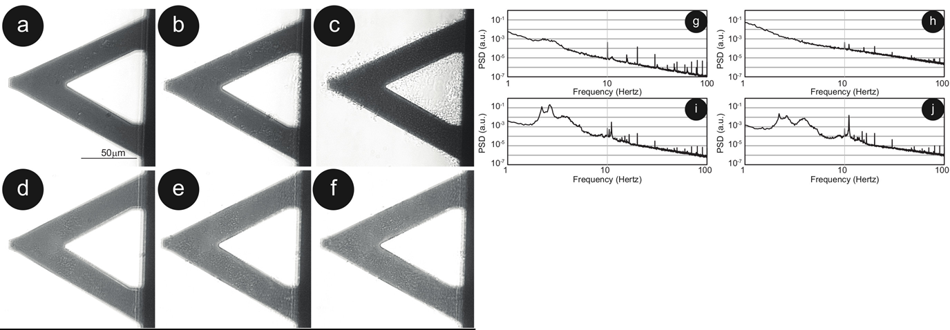 Nell'immagine: rappresentazione del sensore con i batteri (a-f) e la risposte in frequenza delle fluttuazioni di nanomovimento (g-j)