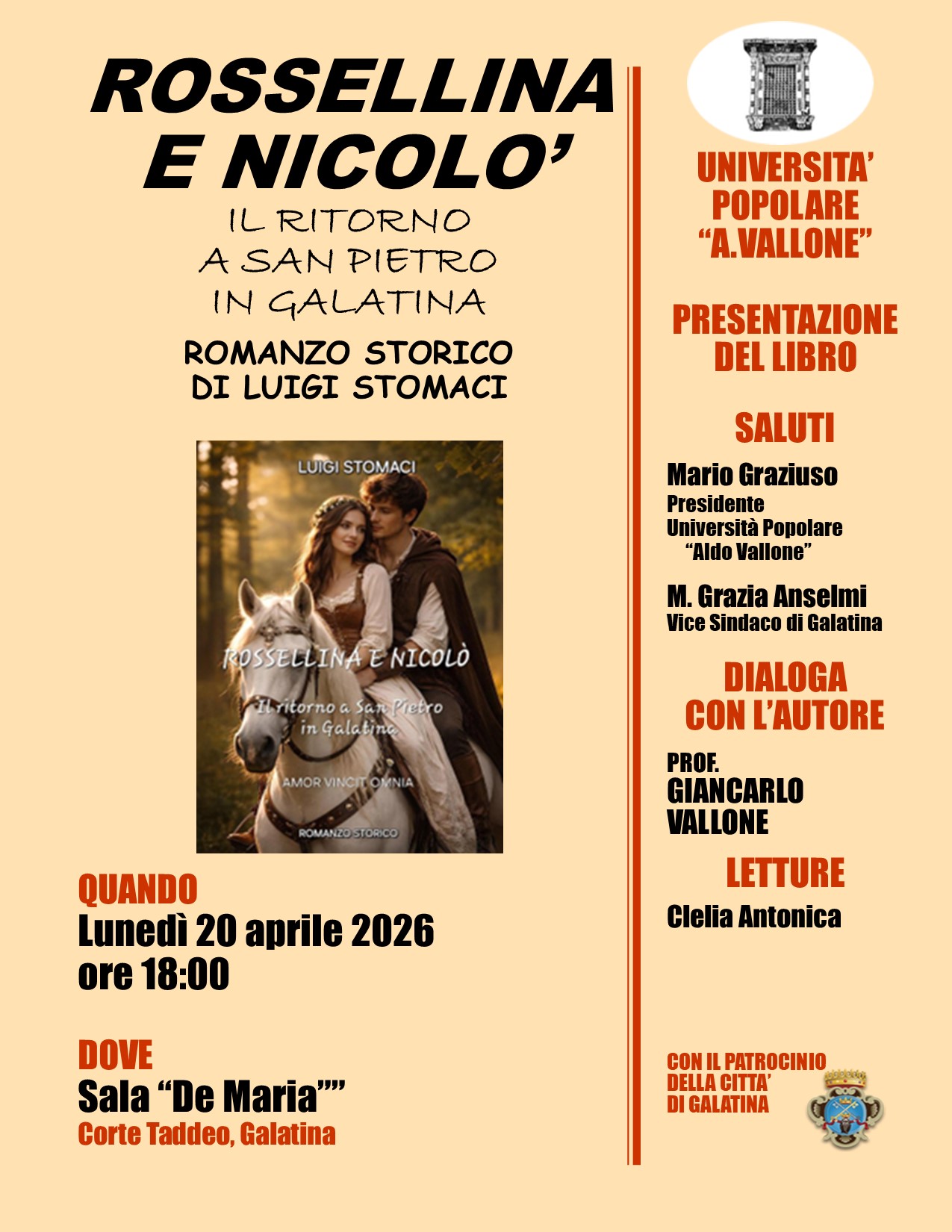 L’Università Popolare “Aldo Vallone”, con il patrocinio della città di Galatina, presenta oggi lunedì 20 aprile 2026 alle ore 18:00 nella Sala conferenze “De Maria”, in Corte Taddeo, l’ultima prova narrativa del nostro Consigliere Luigi Stomaci dal titolo "Rossellina e Nicolò. Il ritorno a San Pietro in Galatina”, pubblicato nel 2025 direttamente dall’autore tramite la piattaforma di Selfpublishing Youcanprint.